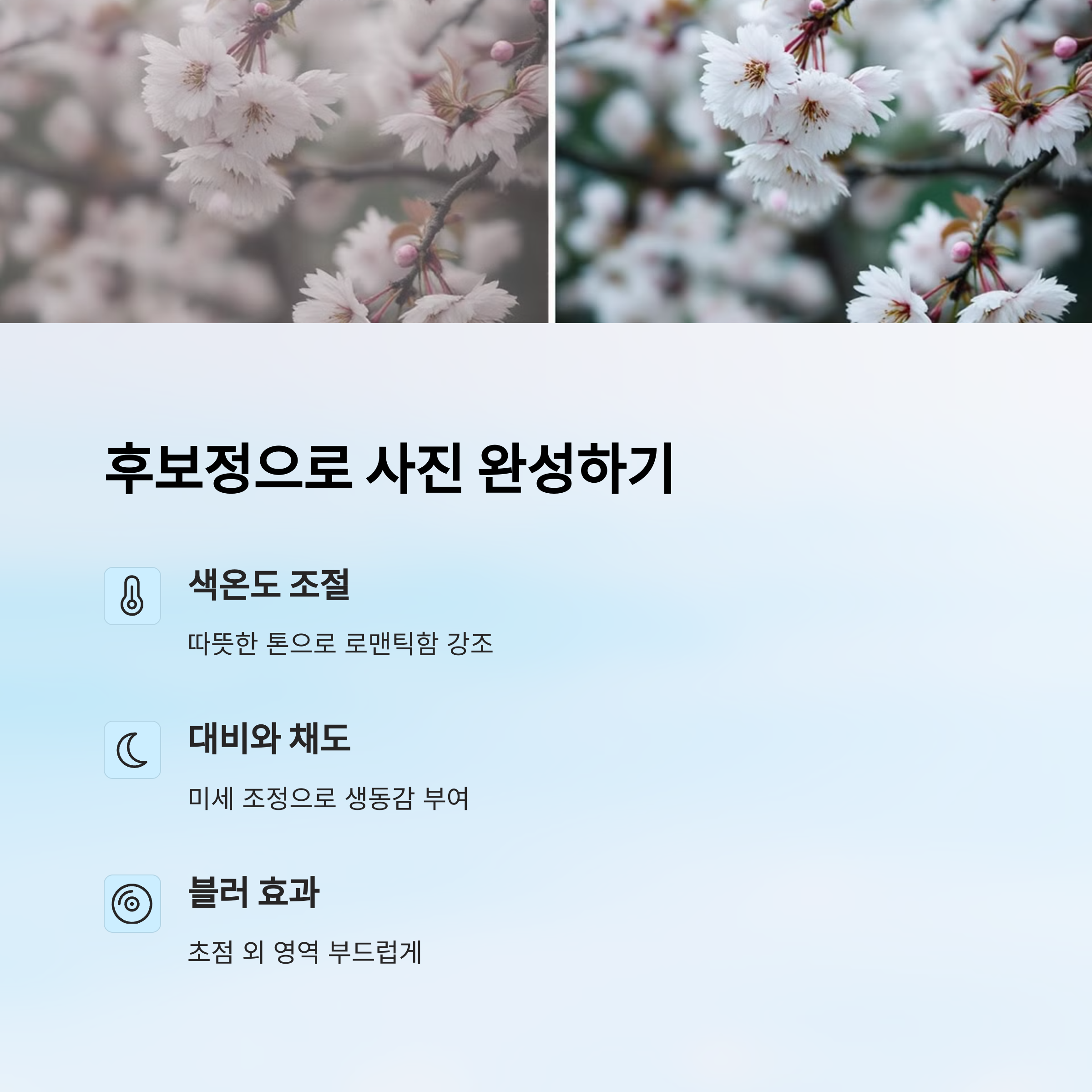 색온도(White Balance)를 조절하면 분위기를 바꿀 수 있어요. 따뜻한 색감으로 가면 로맨틱한 느낌, 차가운 색감은 청량한 느낌을 줄 수 있어요. 이건 원하는 스타일에 따라 자유롭게 시도해보면 좋아요.