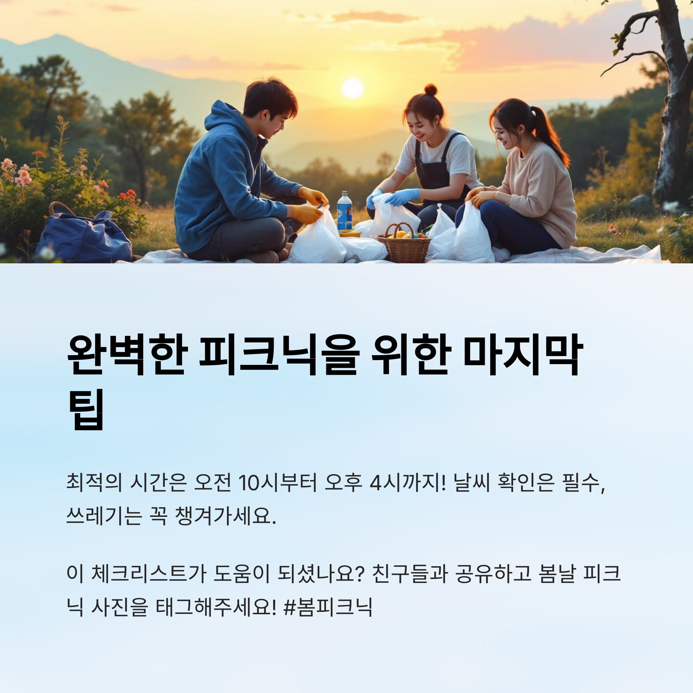 갑작스러운 비를 대비해 접이식 우산이나 방우 담요도 준비해두면 유용해요. 날씨 앱을 참고하더라도, 봄날은 예측 불가한 상황이 종종 발생하니까요!