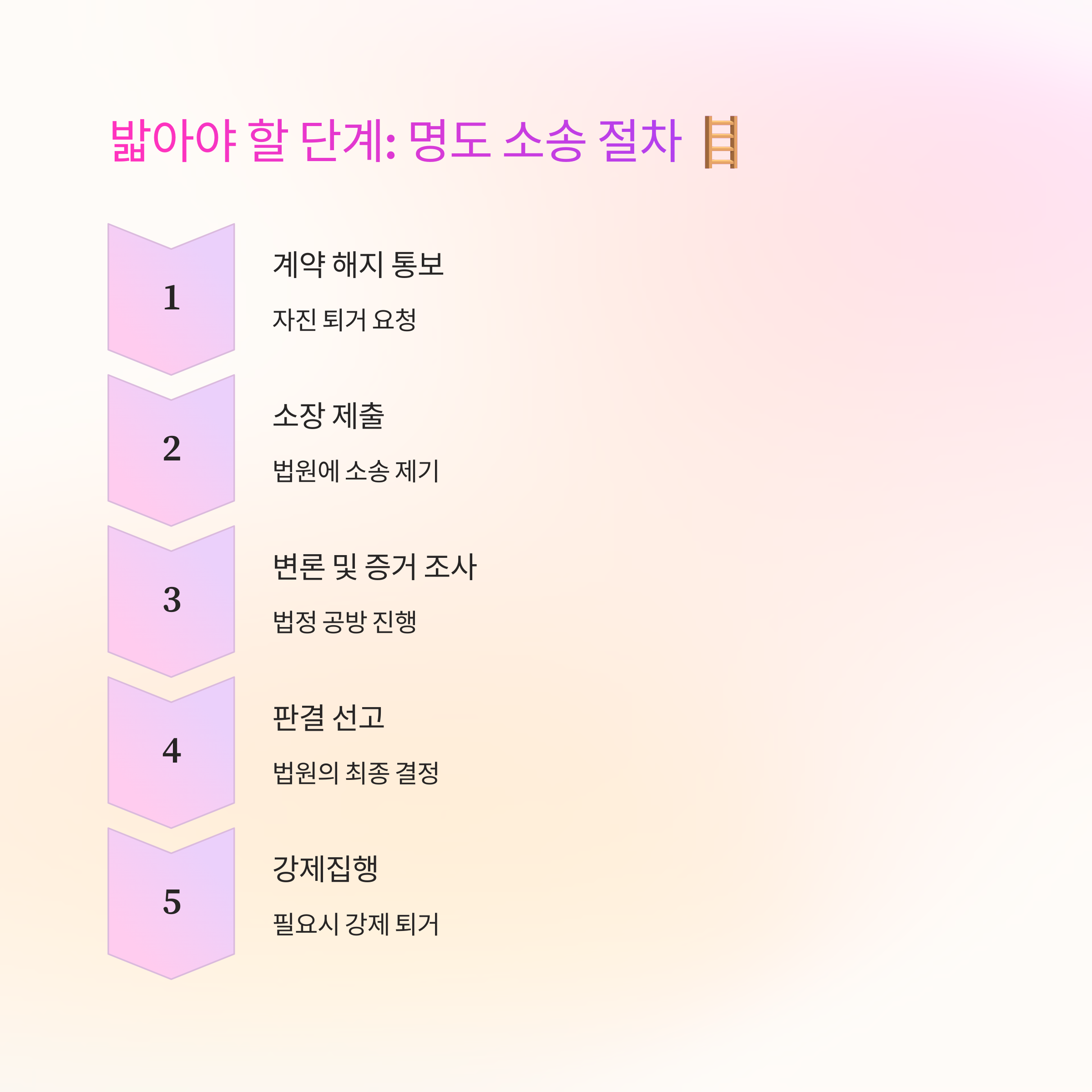 명도 소송은 대개 다음과 같은 단계로 진행돼요. 첫 번째는 내용 증명 발송이에요. 임대인은 임차인에게 퇴거 요청 및 계약 종료 사실을 공식적으로 통지해야 해요. 이 내용 증명은 추후 법적 증거로 사용될 수 있으니 반드시 발송 사실을 기록으로 남겨야 해요.