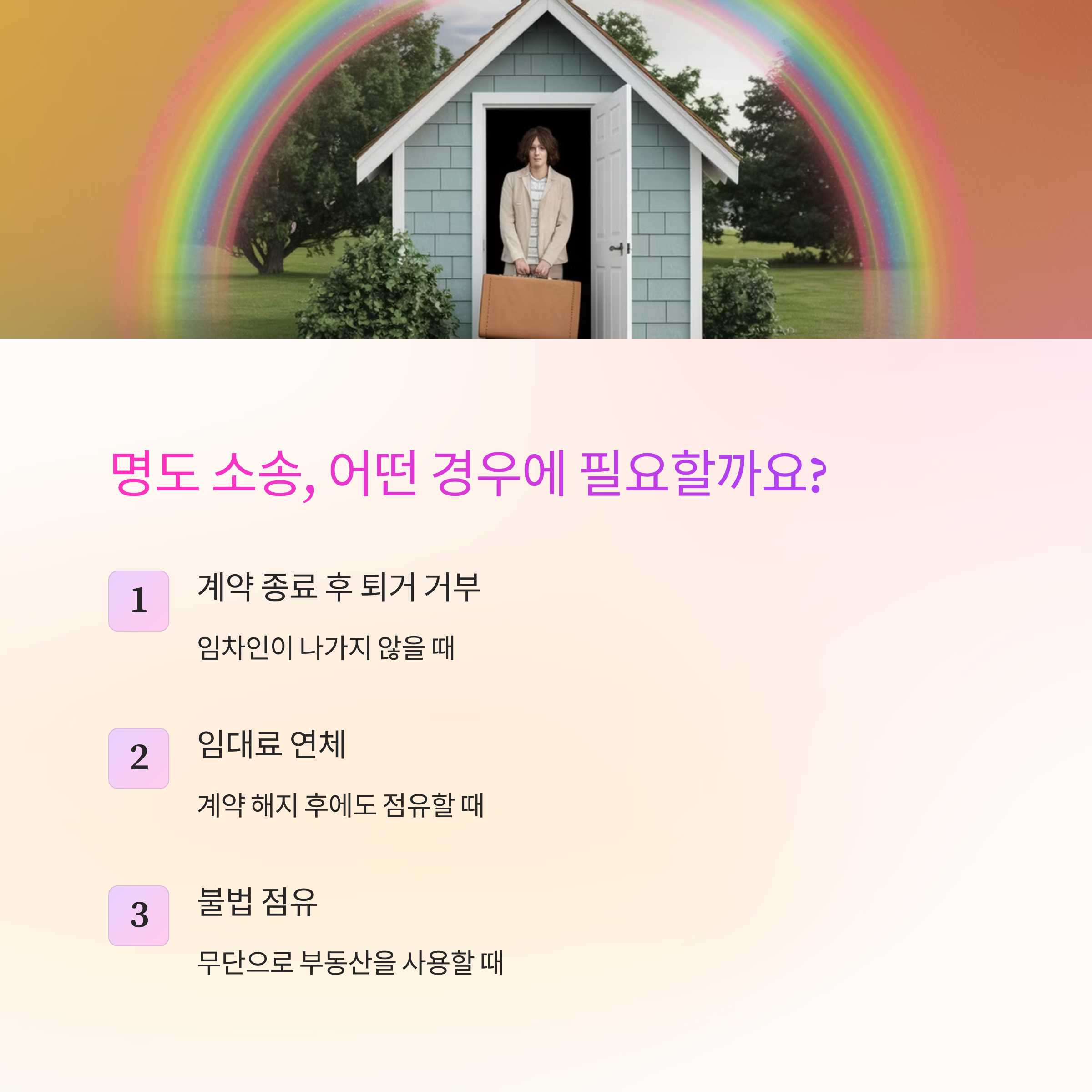 명도 소송은 법적 용어로, 임대인이 정당한 권리에 따라 부동산 점유권을 회복하기 위해 법원에 제기하는 소송을 말해요. 예를 들어, 상가 임대차 계약이 종료되었지만 임차인이 불법 점유를 지속하거나, 주택 임차인이 계약 기간 중 임대료를 장기간 미납하고 퇴거를 거부하는 상황이 이에 해당해요.