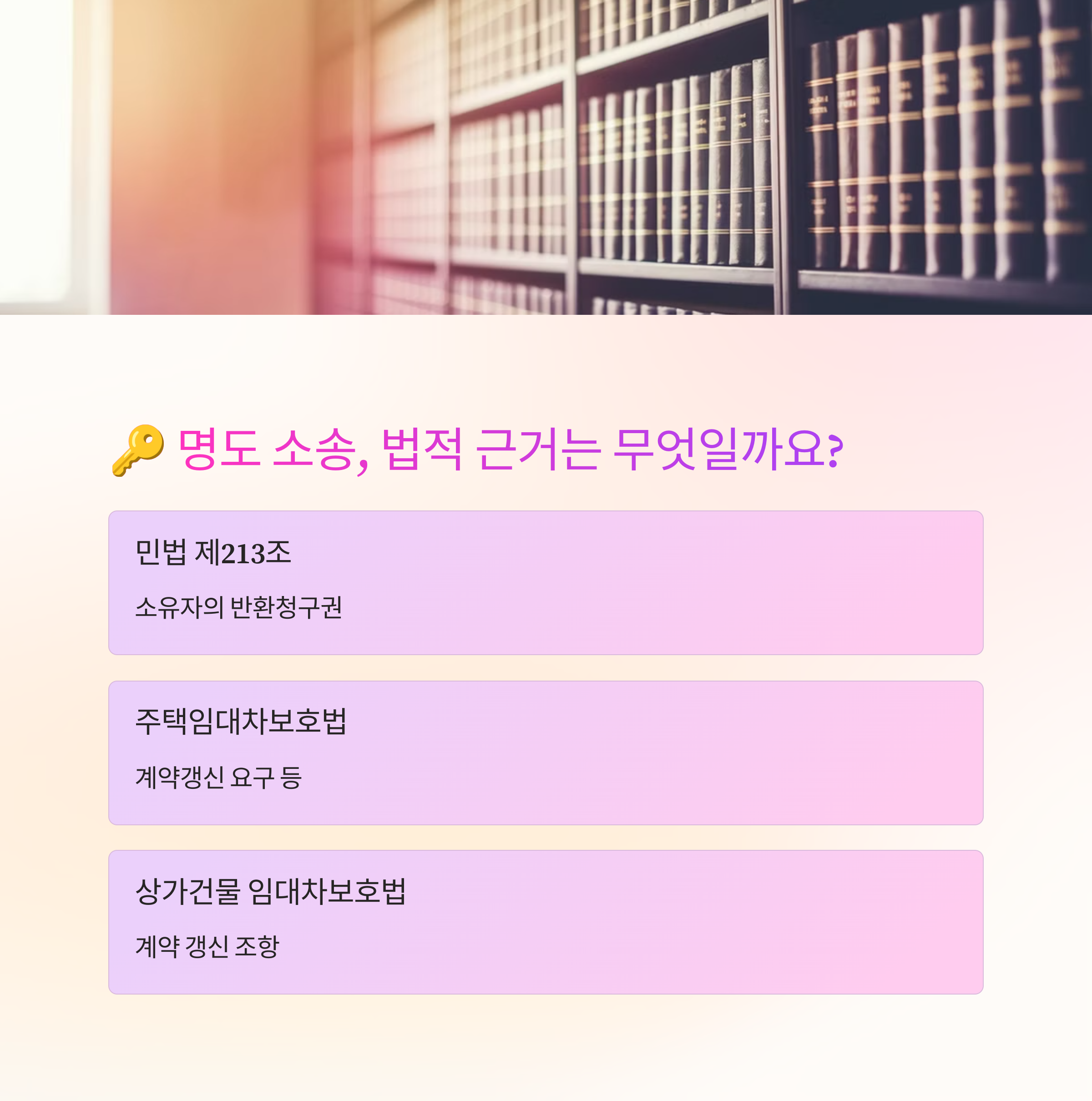 명도 소송의 법적 근거는 민법과 주택임대차보호법, 상가건물임대차보호법 등에 기초하고 있어요. 민법에서는 계약의 종료와 점유 반환에 대한 내용을 규정하며, 임대차 계약의 종료 시 임차인은 해당 부동산을 임대인에게 반환해야 한다고 명시하고 있어요.