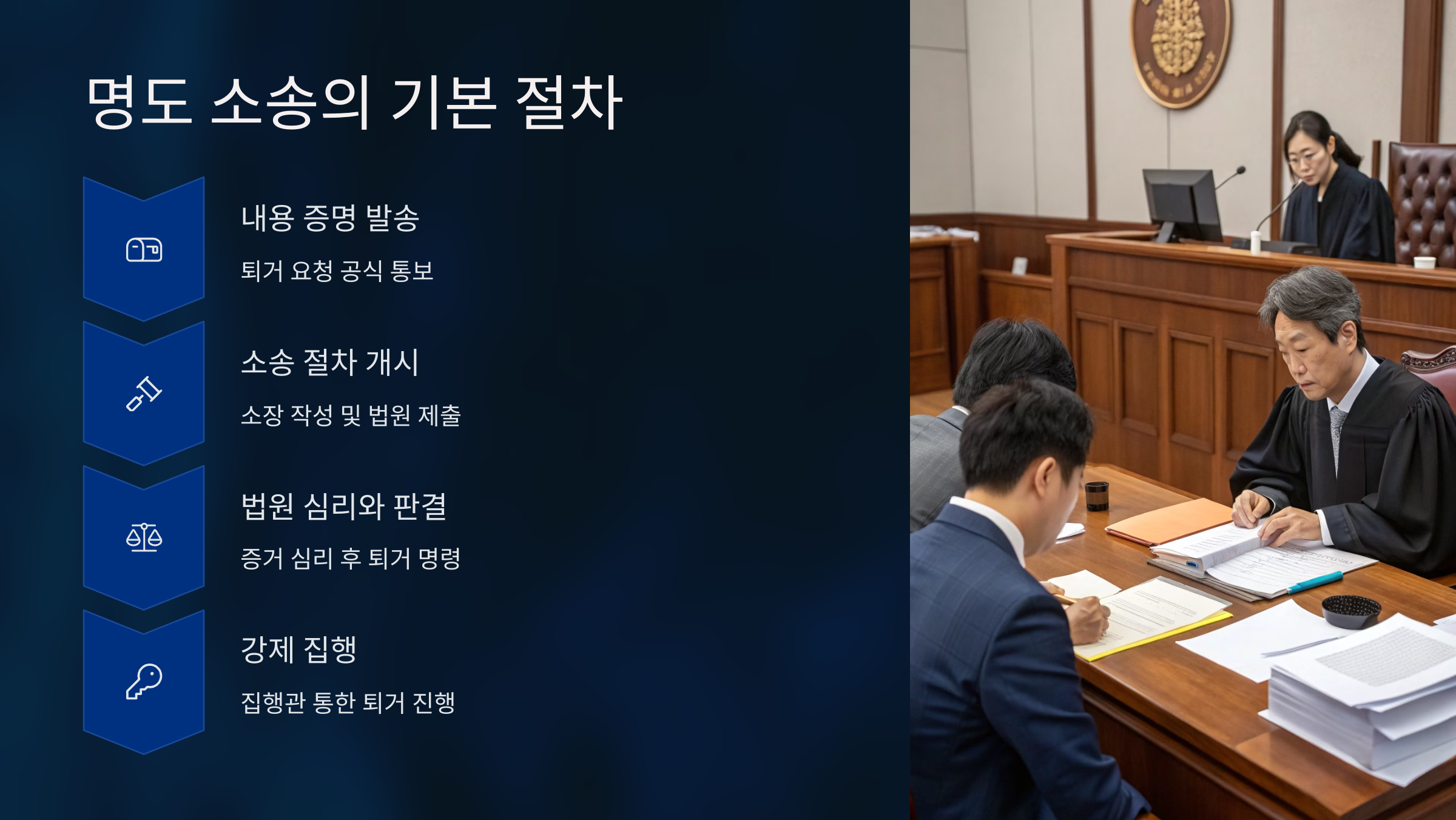 명도 소송은 여러 단계를 거쳐 진행되며, 각 단계마다 중요한 법적 요소가 포함돼 있어요. 첫 단계는 내용 증명 발송이에요. 임대인은 퇴거 요청 내용을 담은 내용 증명을 작성해 임차인에게 발송하고, 계약 종료와 명도를 요청해야 해요. 이 과정에서 대화와 합의가 이루어진다면 소송 없이 해결할 수도 있답니다.