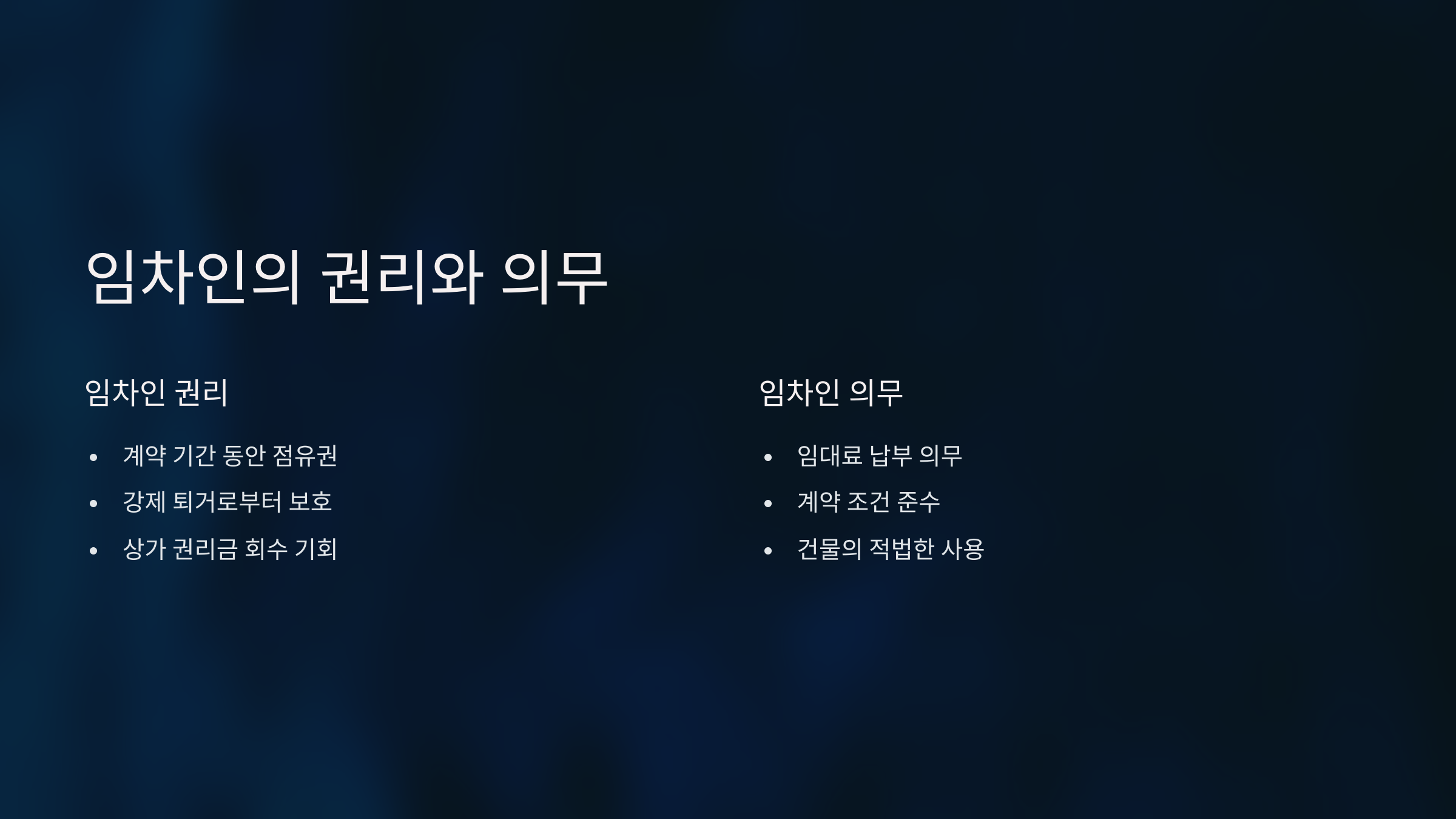 그러나 임차인도 계약 조건을 준수할 의무가 있어요. 임대료 납부, 계약 내용 준수, 건물의 적법한 사용 등이 이에 포함돼요. 만약 임차인이 계약 조건을 위반하거나, 불법적인 행동을 한다면 임대인은 계약 해지를 요구할 수 있어요.