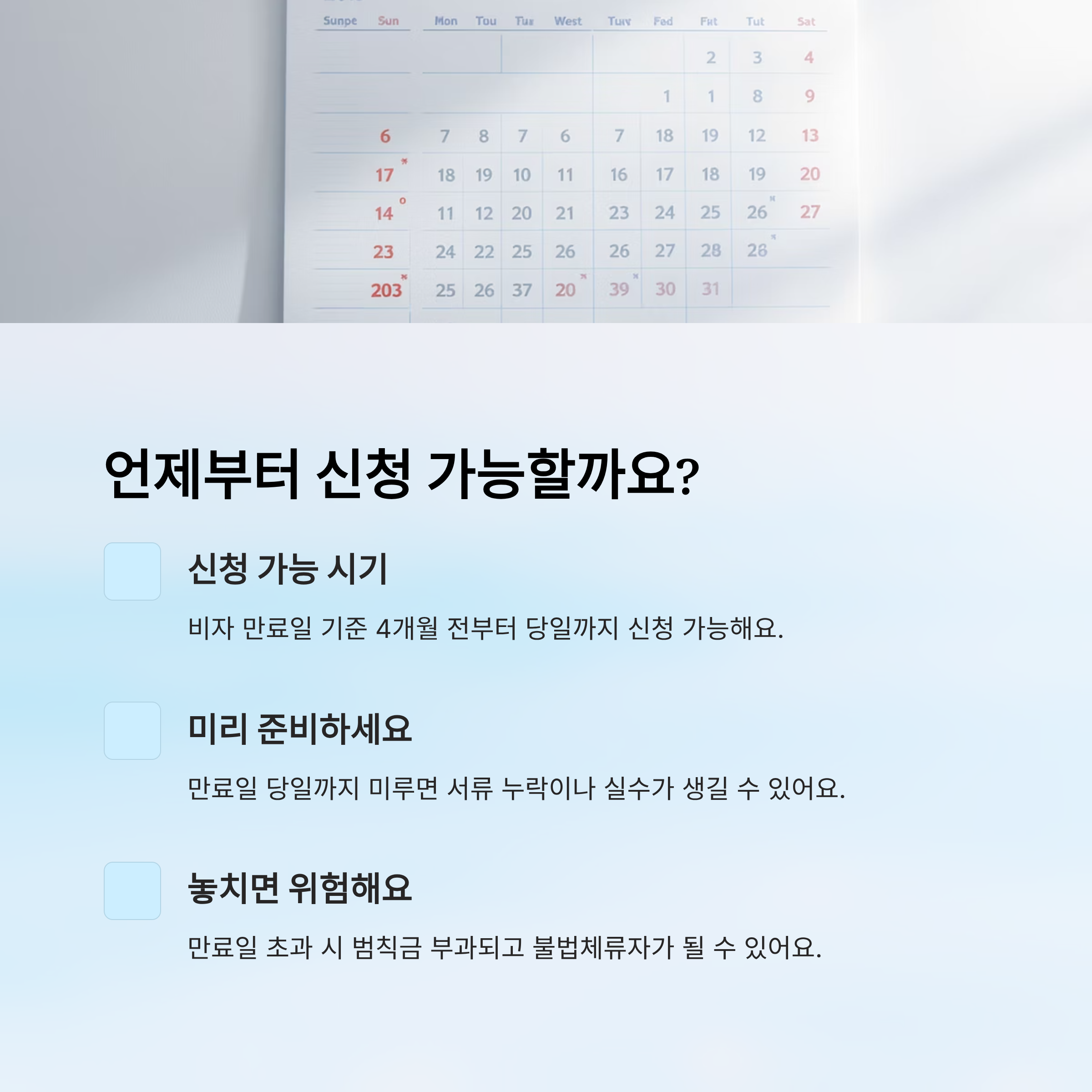 무심코 지나쳤다가 ‘불법 체류자’가 되는 일은 피하고 싶죠? 📆 미리 달력에 표시해두고, 여권 유효기간도 함께 체크하는 게 안전해요!