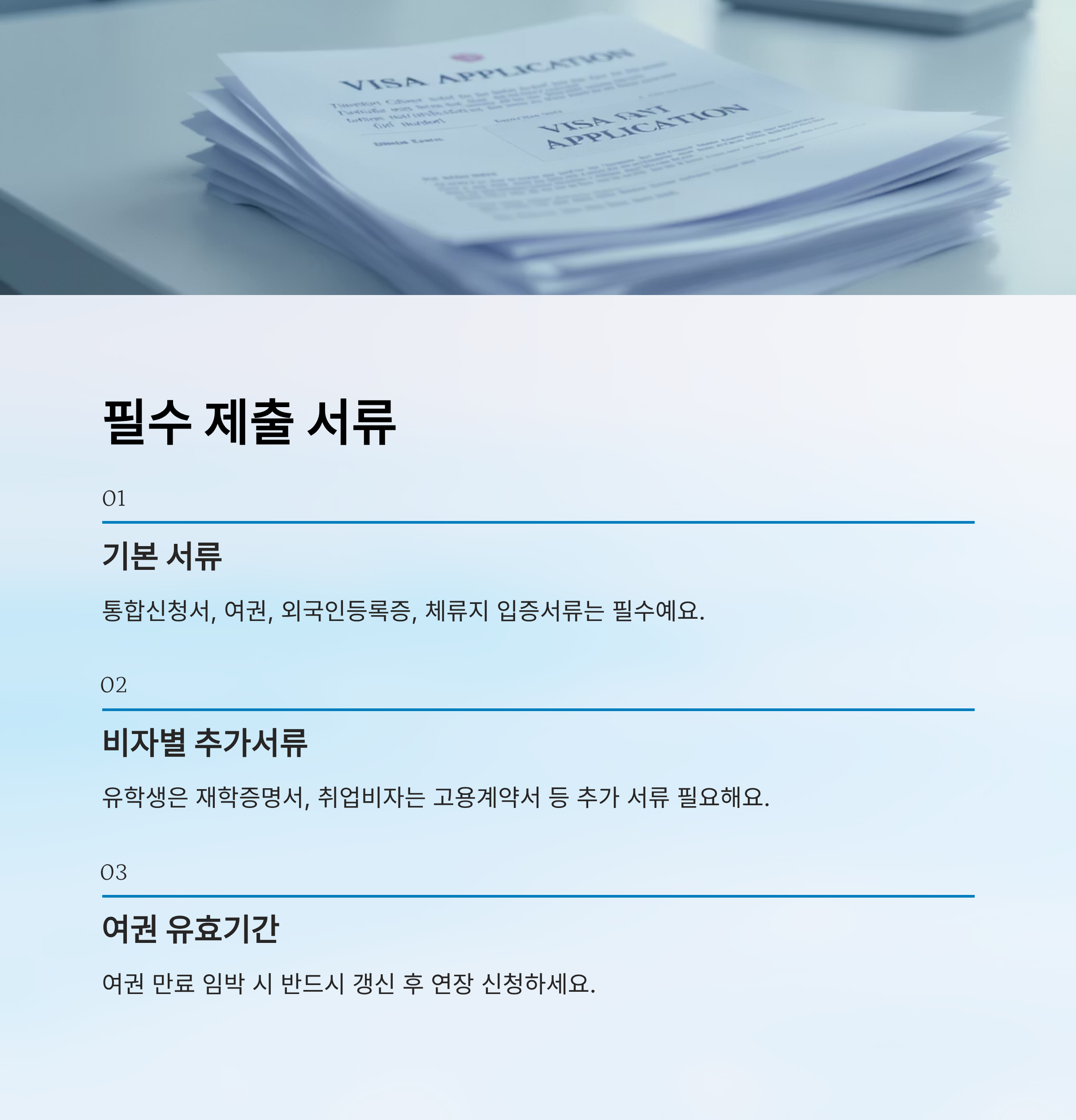 | 해당 비자별 추가서류 | 고용계약서, 재학증명서, 결핵검진서 등 |