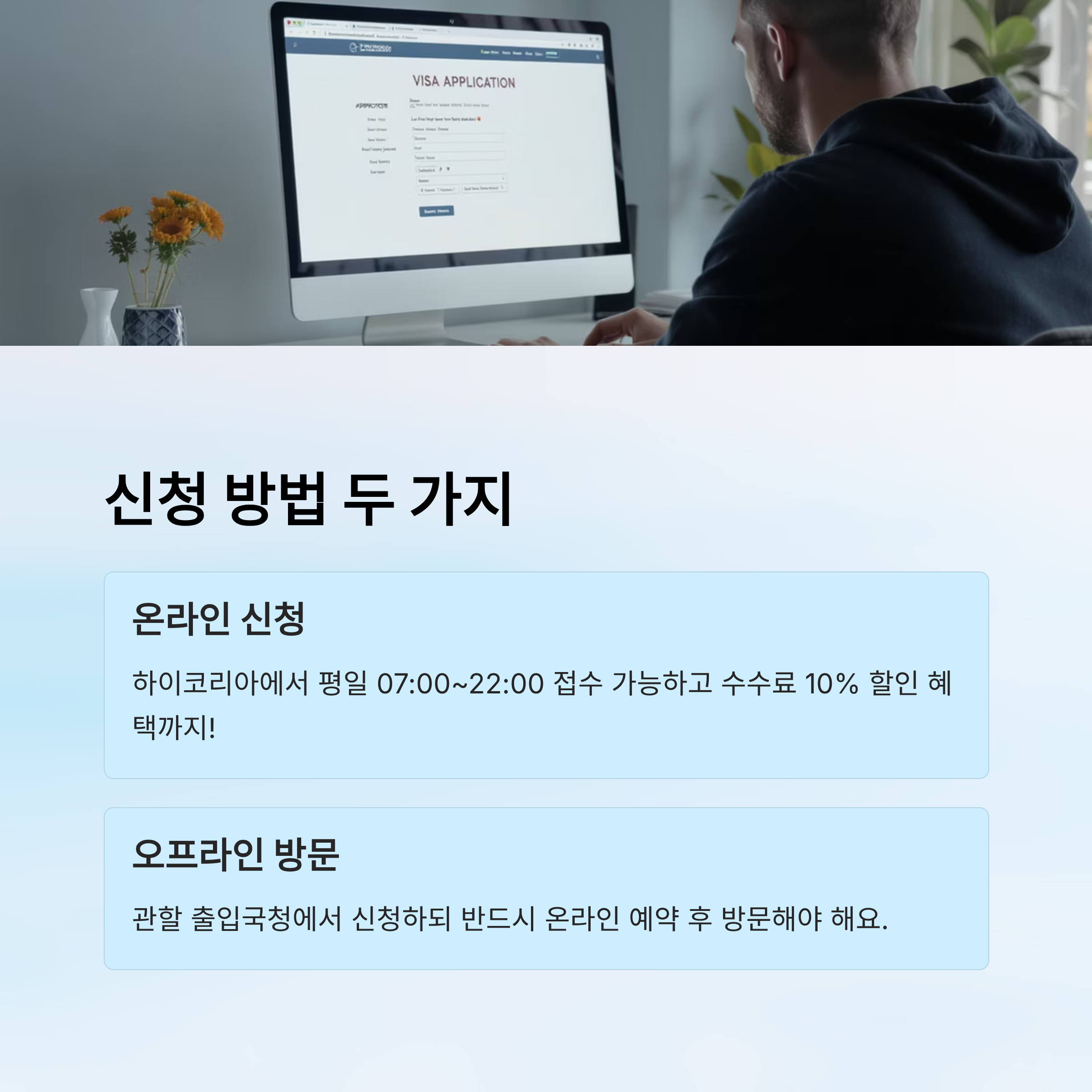 비자 연장은 오프라인 방문과 온라인 전자민원, 두 가지 방법으로 신청할 수 있어요. 온라인은 빠르고 수수료도 10% 감면돼서 많은 분들이 선호해요. 하이코리아(www.hikorea.go.kr)에서 신청할 수 있어요.