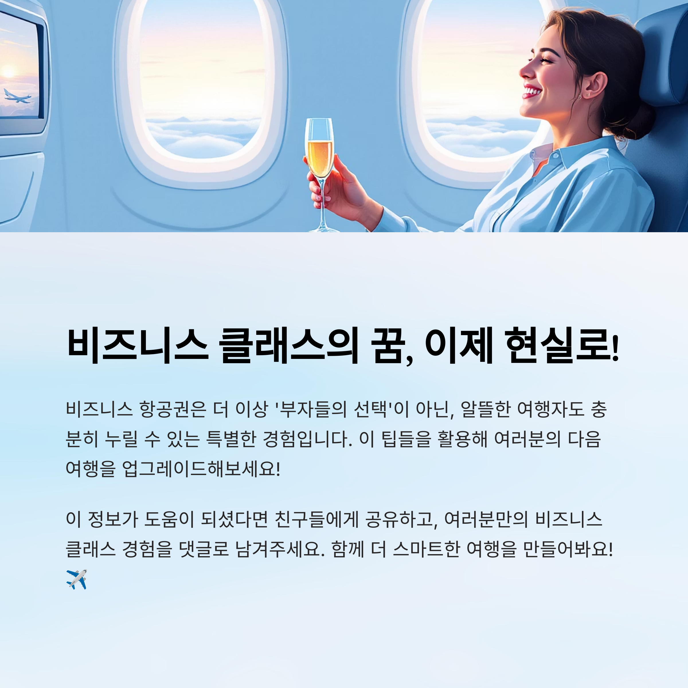 그래서 비즈니스 항공권은 단순히 '부자들의 선택'이 아닌, 알뜰한 여행자들도 충분히 즐길 수 있는 여행의 또 다른 방식이라고 할 수 있어요. 여행 스타일과 예산에 맞춰 현명하게 선택하면 정말 만족도가 높답니다.