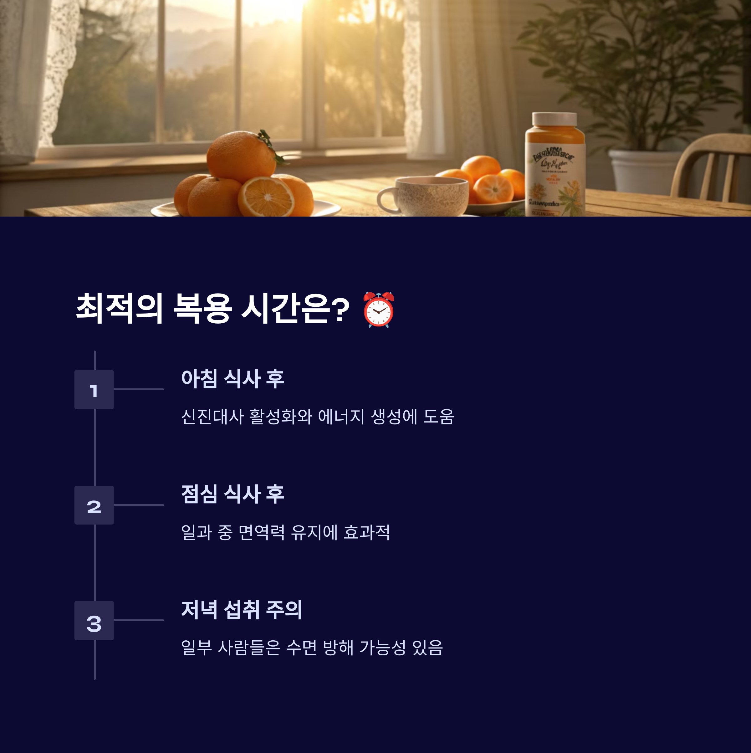 | 아침 복용 | 면역력 강화, 에너지 증진 | 공복 시 속 쓰림 가능성 |