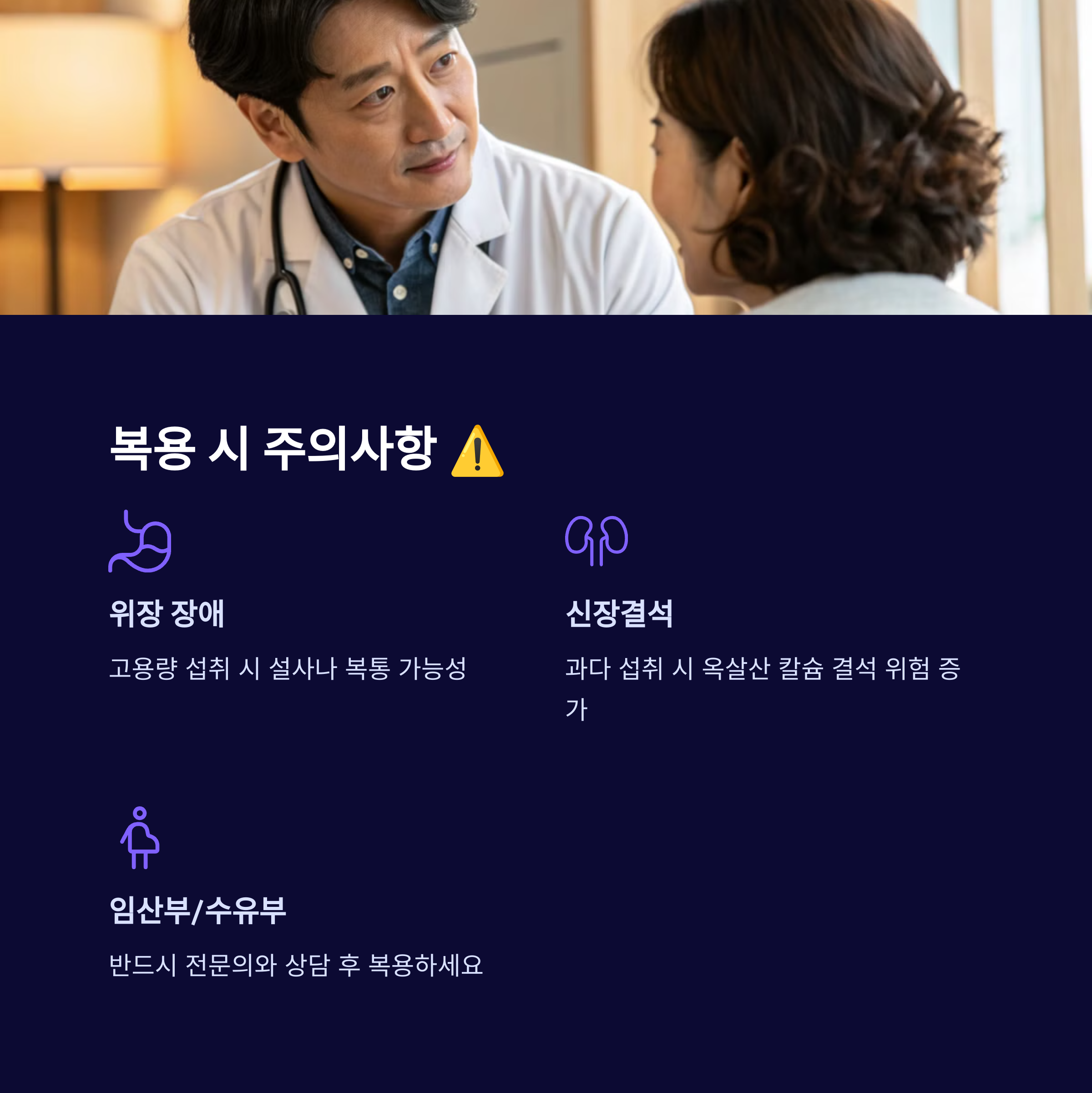 비타민 C는 비교적 안전한 비타민이지만, 잘못된 복용법이나 과다 복용 시 부작용이 나타날 수 있어요. 😊 특히 고용량 복용 시 주의가 필요해요!