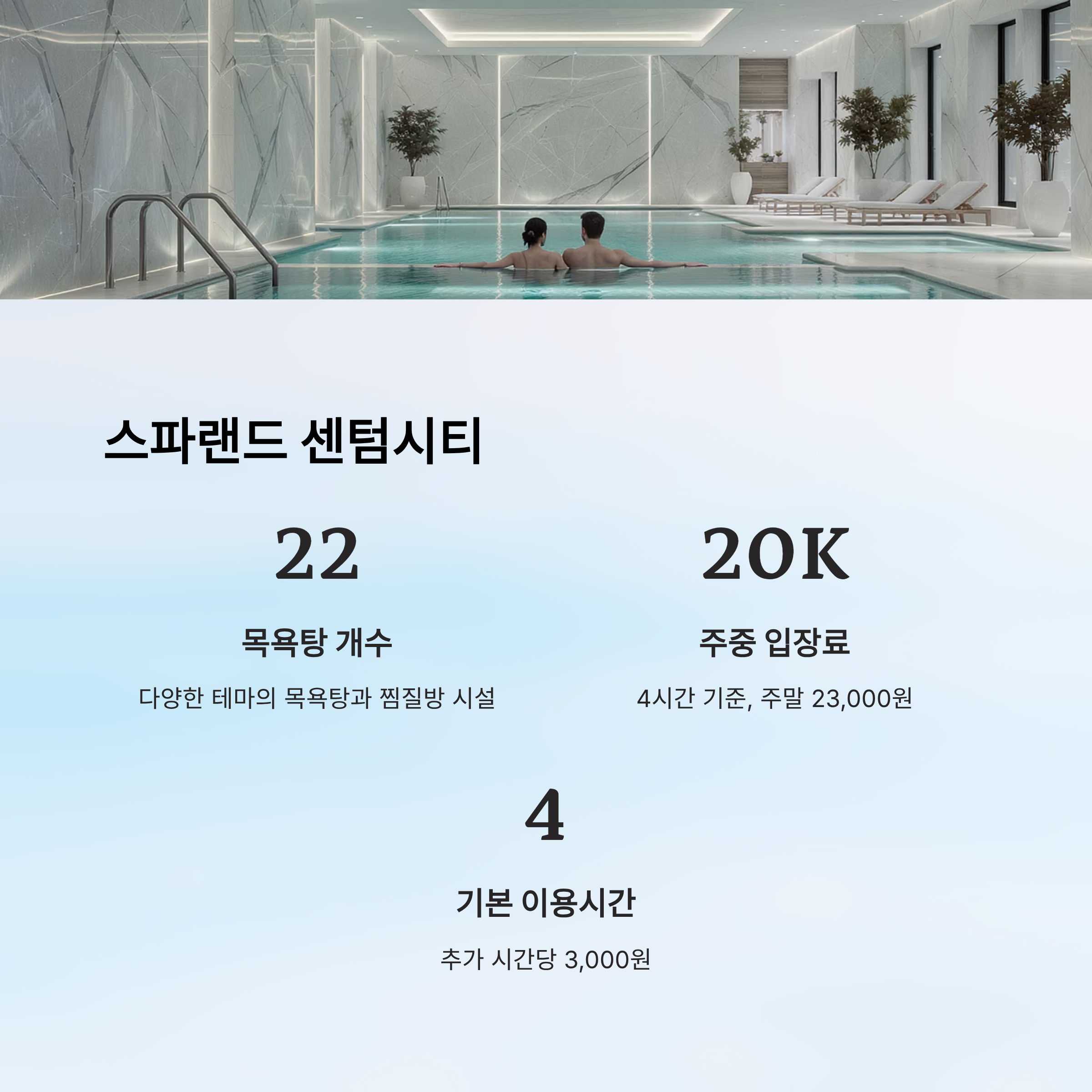 센텀시티 신세계 백화점 내에 위치한 ‘스파랜드’는 부산을 대표하는 프리미엄 찜질 스파예요. 총 22개의 목욕탕과 다양한 찜질방이 있어 하루 종일 머물러도 전혀 지루하지 않아요. 무엇보다 청결도와 시설 퀄리티가 최상이라 커플끼리도 편안하게 휴식할 수 있어요.