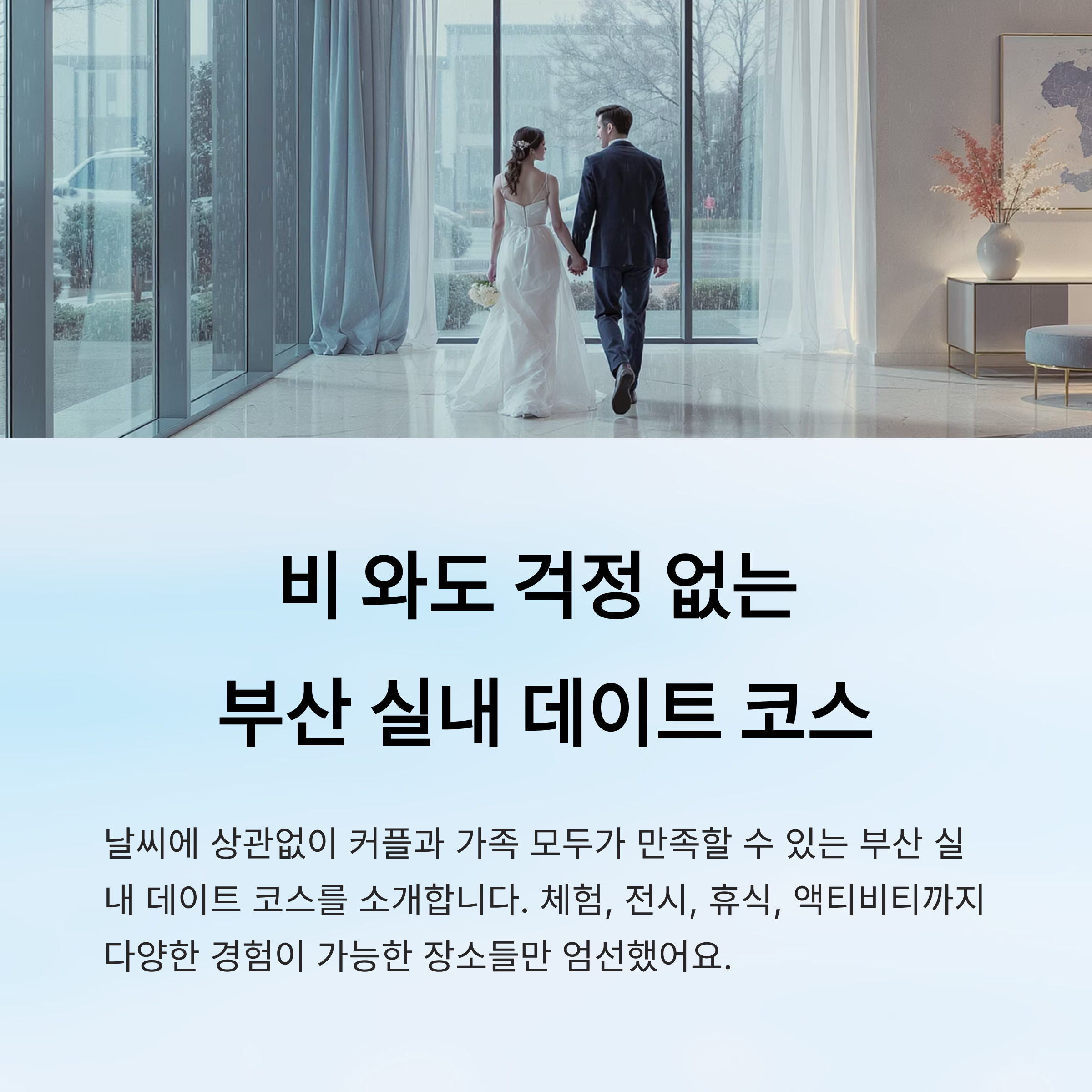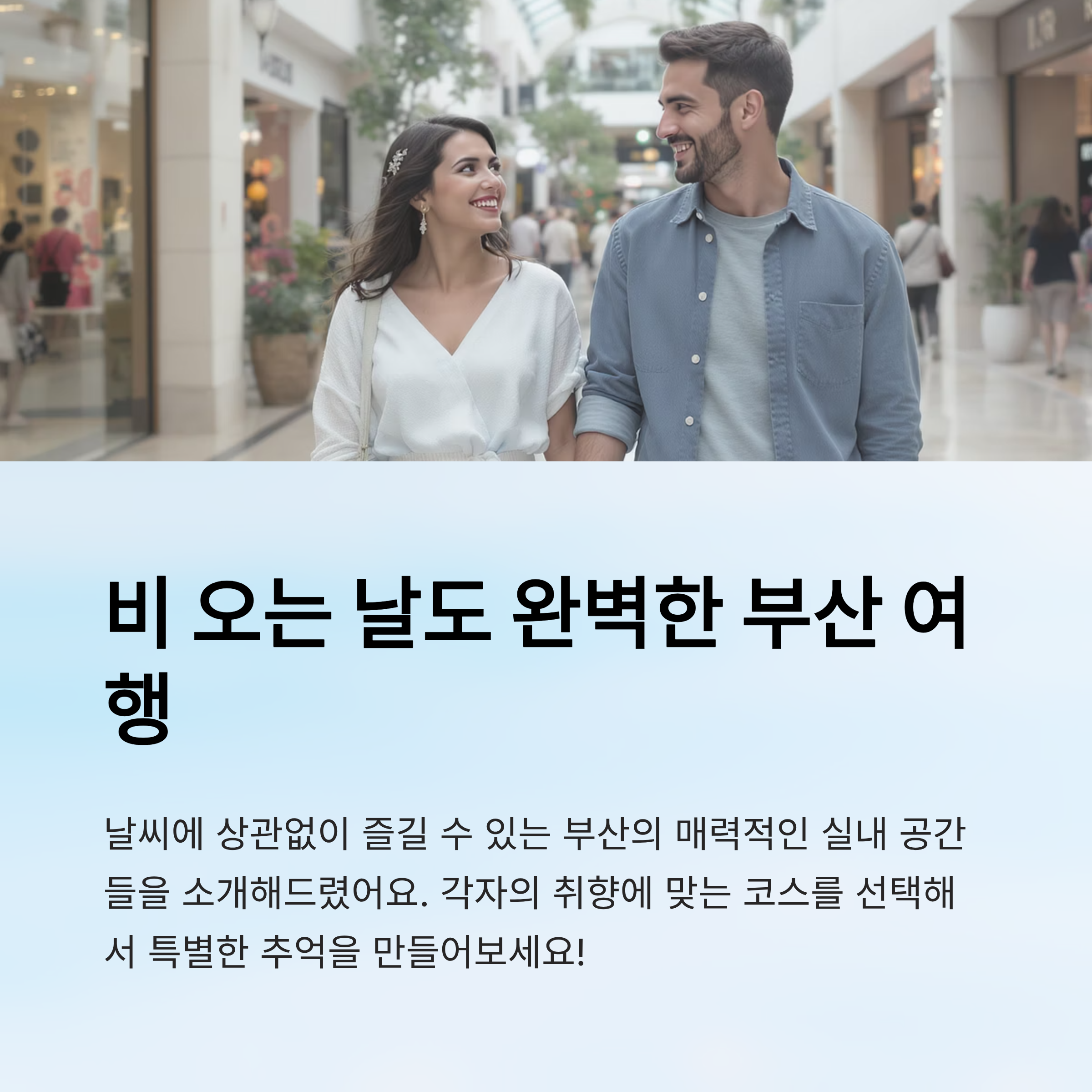 ☔ 비 오는 날 부산 여행, 괜히 망설여진다고요? 그런 걱정은 이제 그만! 날씨에 상관없이 커플과 가족 모두가 만족할 수 있는 부산 실내 데이트 코스를 알려드릴게요. 바다 못 봐도 감성 가득, 음식도 든든하게 챙길 수 있는 코스들이랍니다.