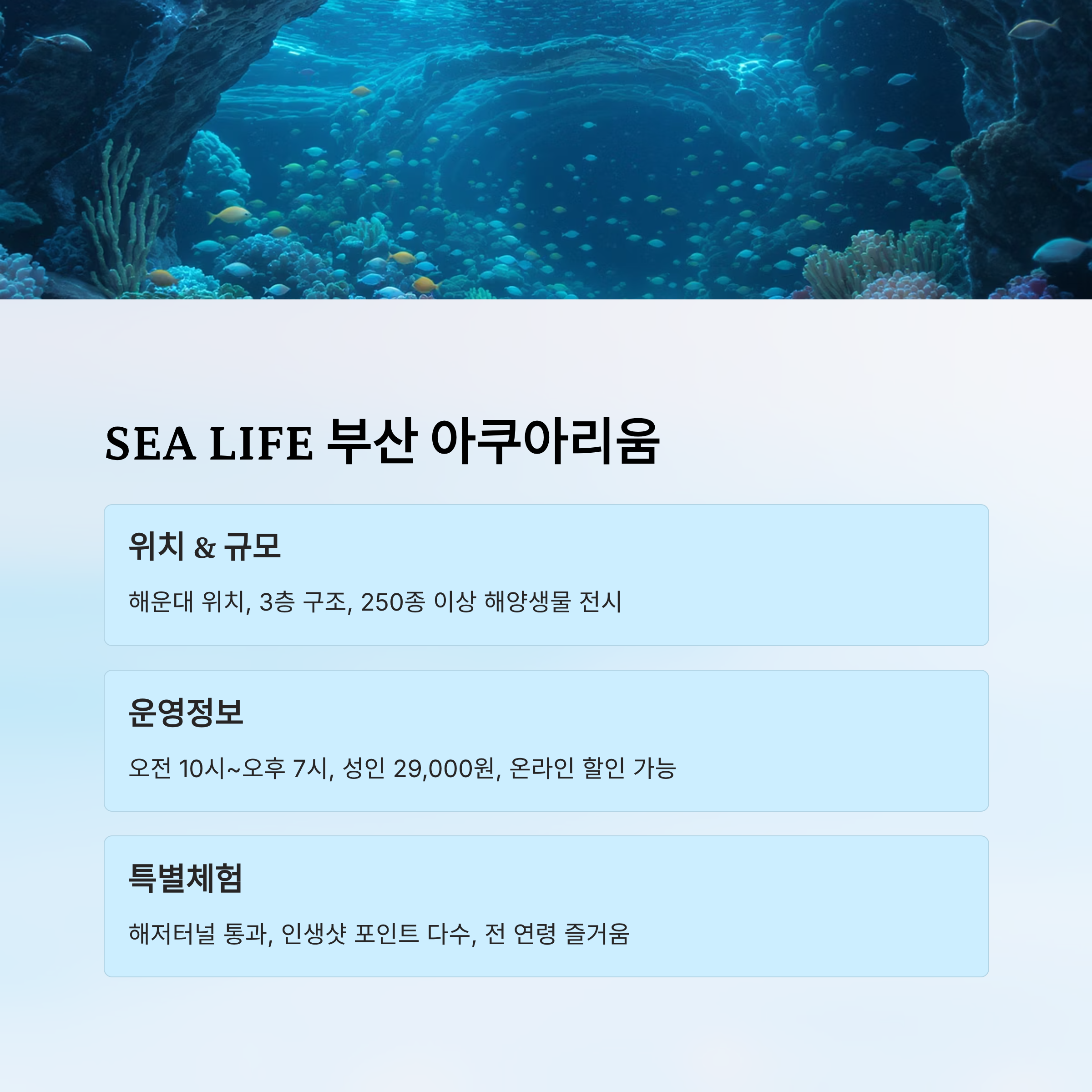 총 3층 구조로 되어 있으며, 약 250종 이상의 해양 생물이 전시되어 있어요. 특히 해저터널을 지나갈 때면 마치 바닷속을 걷는 듯한 기분이 들어요. 인생샷 포인트도 가득하니 인스타용 사진도 걱정 없답니다.