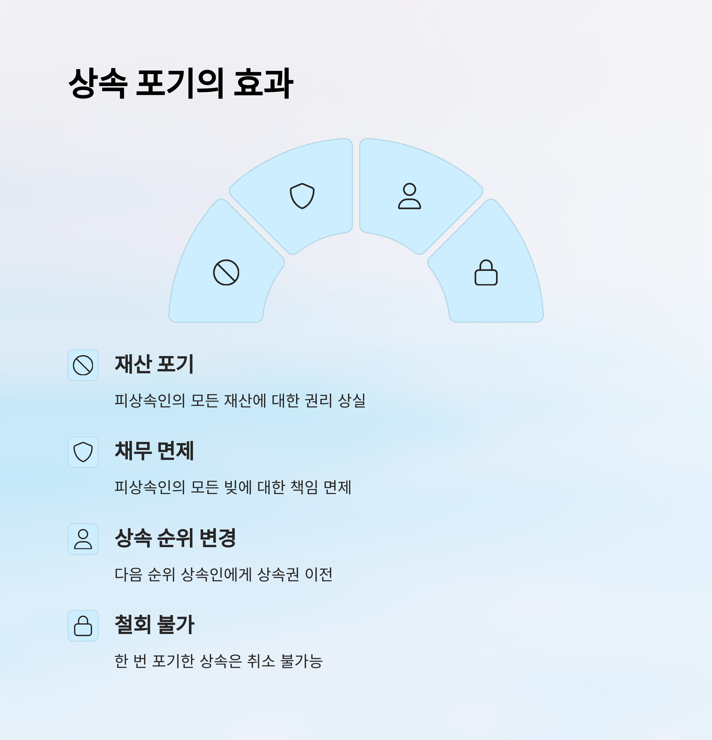 상속을 포기하면, 법적으로는 상속인이 아닌 것처럼 처리돼요. 즉, 원래부터 상속인이 아니었던 것처럼 보는 거죠. 그래서 피상속인의 부채는 물론 재산도 일절 상속받을 수 없게 돼요. 이는 후순위 상속인에게 영향을 주기도 해요.