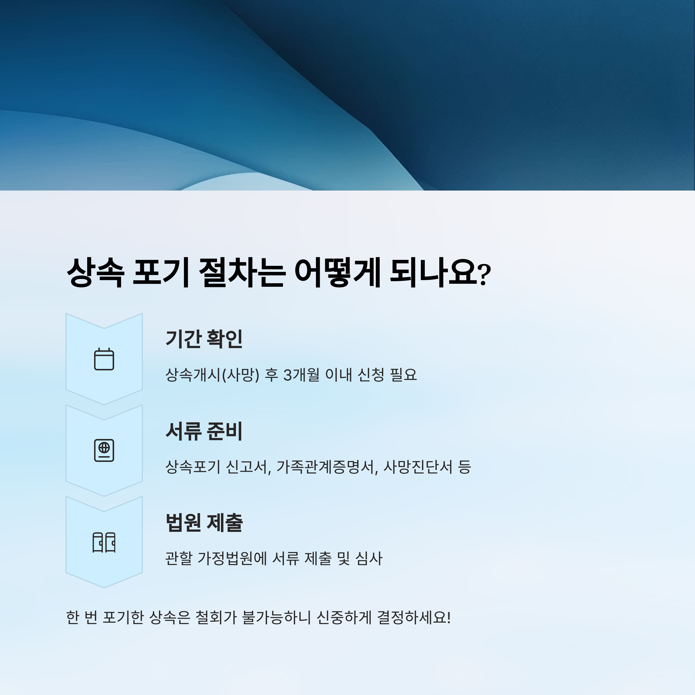 A1. 관할 가정법원에 상속포기 신고서를 제출해야 해요. 신청서와 함께 가족관계증명서, 사망진단서, 주민등록등본 등을 첨부해야 하고, 보통은 민원실에서 접수할 수 있어요.
