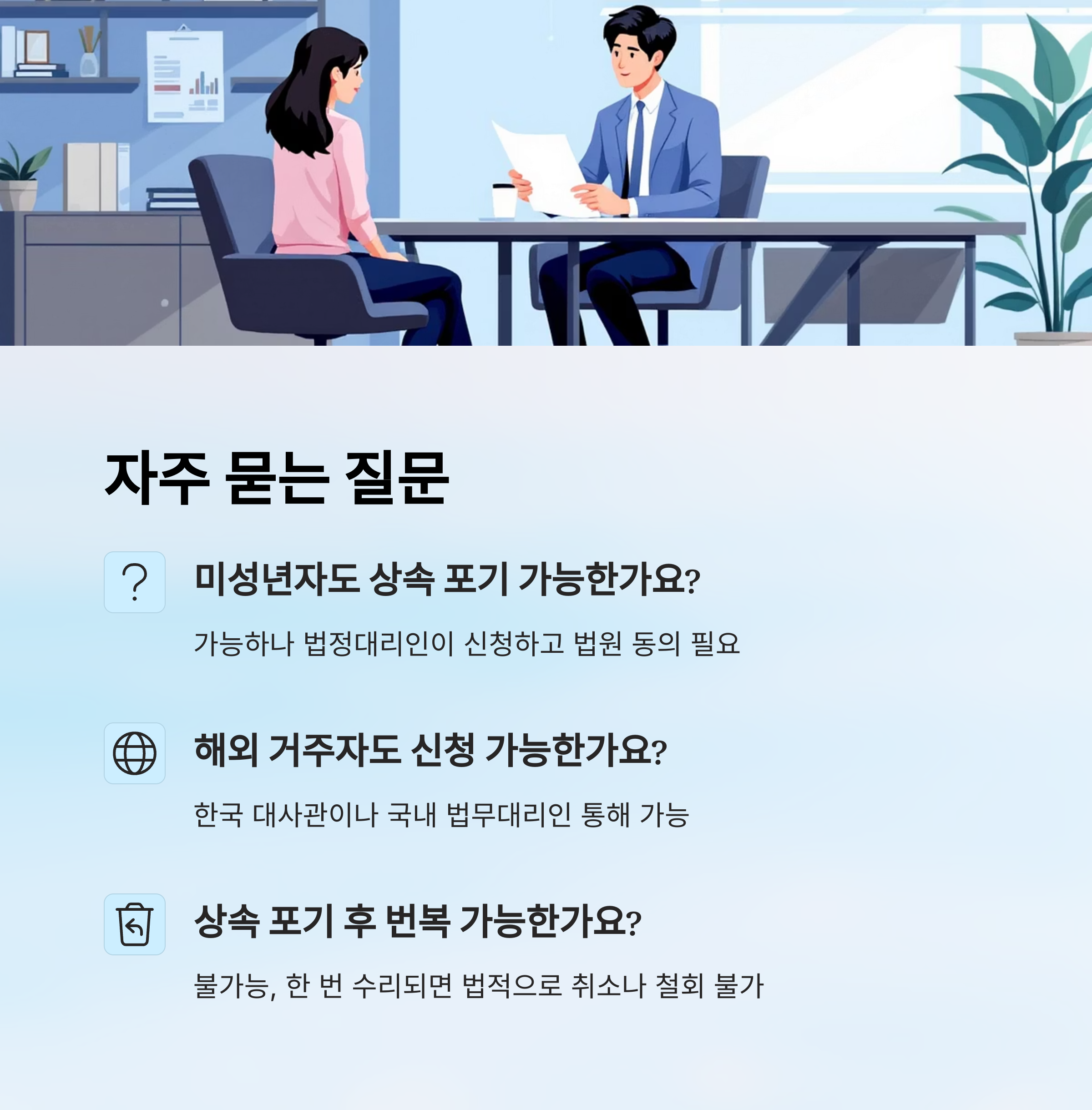 A4. 안 돼요. 한 번 상속 포기가 수리되면 법적으로 취소나 철회는 불가능해요. 그래서 결정 전에 신중하게 생각해야 해요.