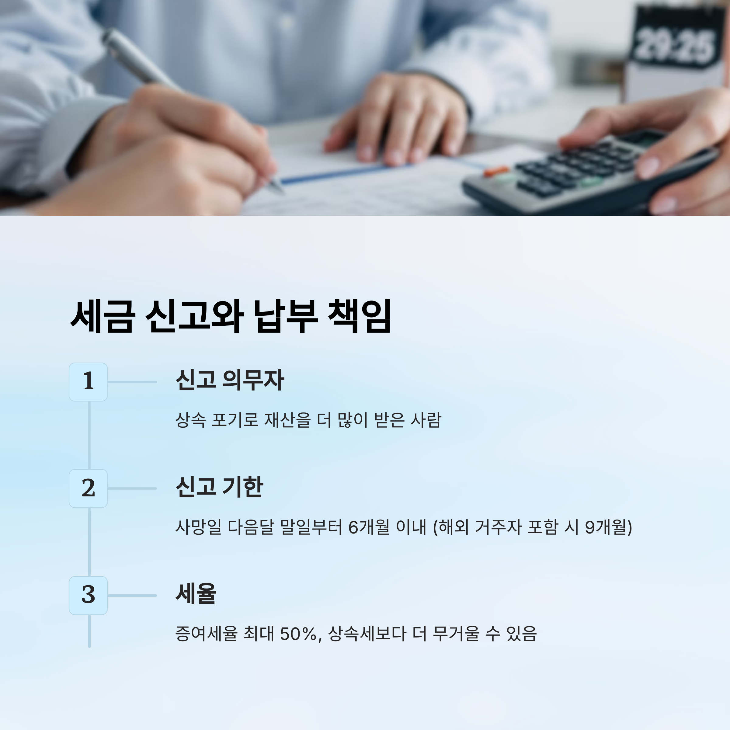 예를 들어 셋 중 두 명이 포기하고 한 명이 전부 상속받았다면, 그 한 명이 세무서에 신고해야 해요. 만약 증여로 간주되는 구조라면, 증여세율(최대 50%)이 적용될 수도 있어요. 상속세보다 더 무거울 수 있는 거죠!