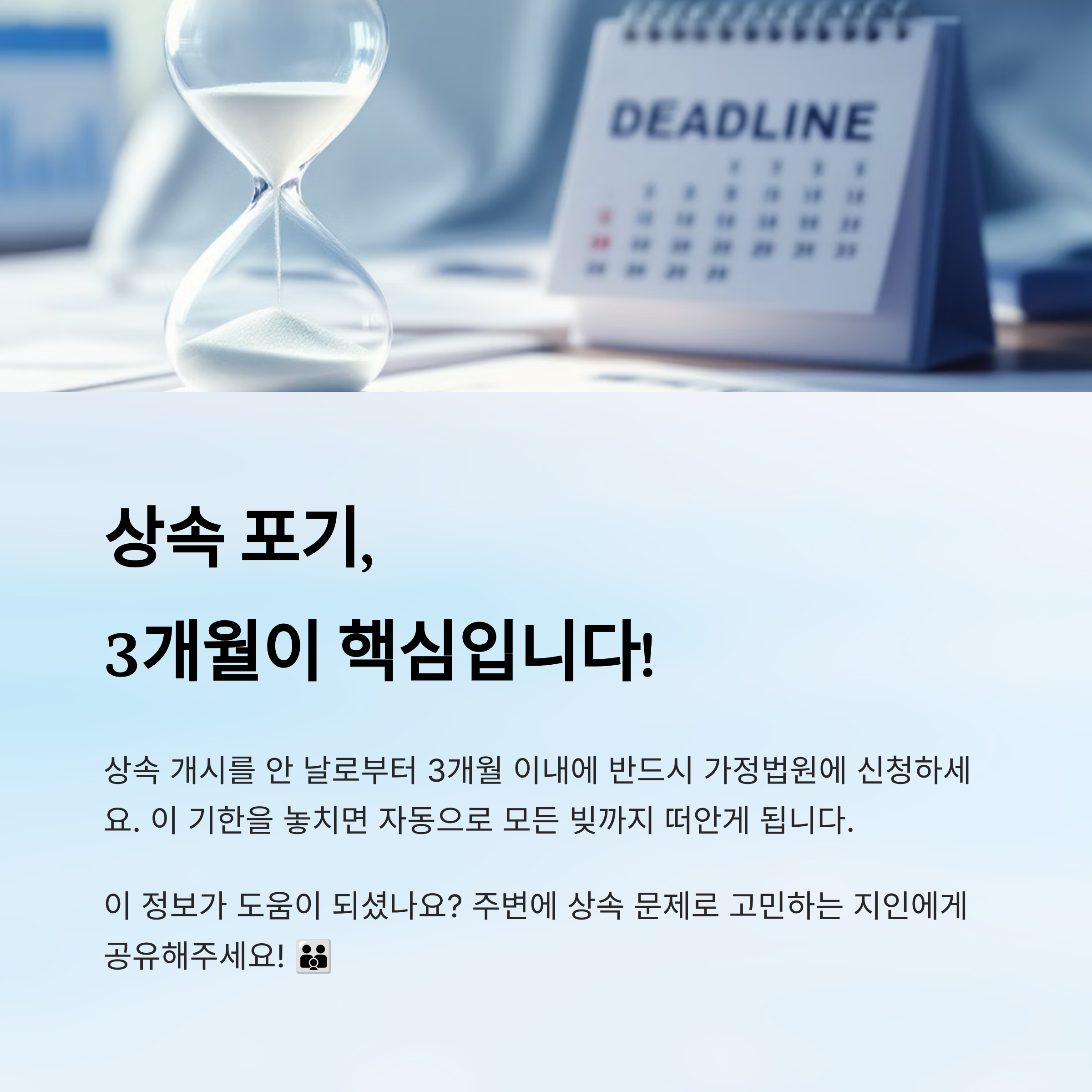 민법 제1019조에 따라 상속인은 상속 개시가 있음을 안 날로부터 3개월 이내에 상속을 포기하거나 한정승인을 신청할 수 있어요. 이 기한을 넘기면 '단순 승인'으로 간주되어 빚도 함께 상속받게 된답니다. 이 부분이 가장 중요해요!
