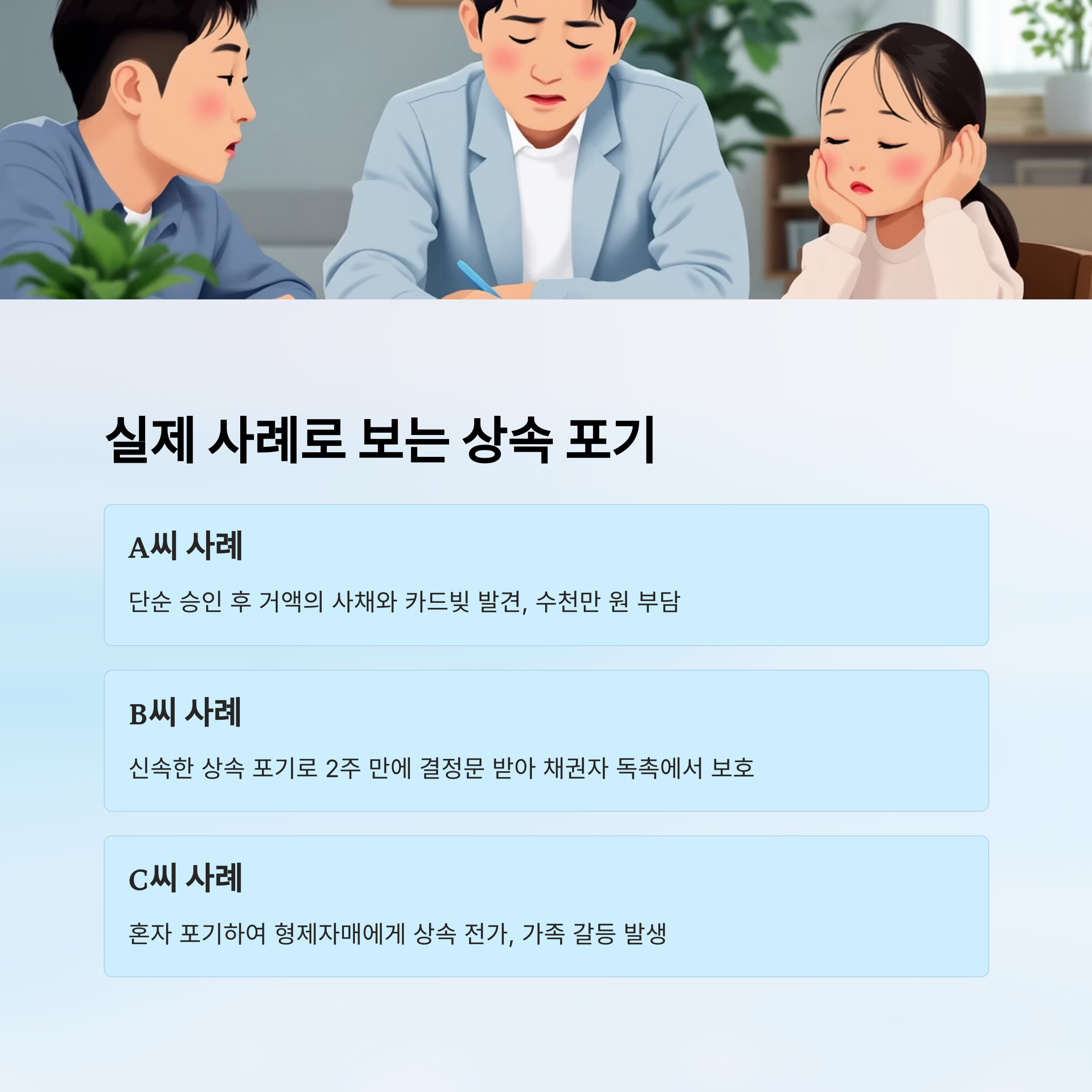 실제 사례를 보면 상속 포기의 필요성과 결과가 더 실감나게 다가와요. 예를 들어, A씨는 아버지가 사망한 후 아파트와 차량 등 재산이 있다고 생각하고 단순 승인을 했지만, 나중에 거액의 사채와 카드빚이 발견되어 엄청난 부담을 떠안게 됐어요.