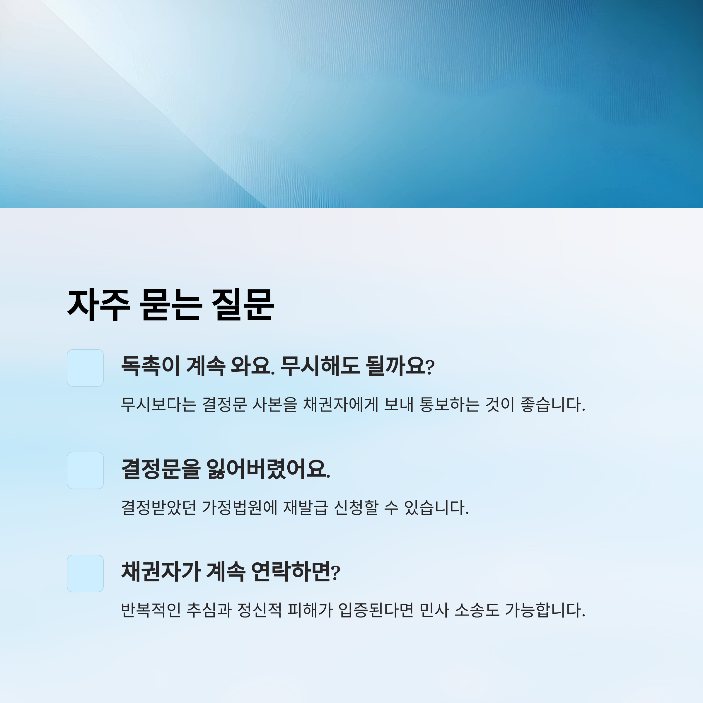 A1. 무시보다는 '결정문 사본'을 채권자에게 보내고 통보하는 게 좋아요. 법적으로 포기했음을 명확히 알려야 연락이 멈춰요.
