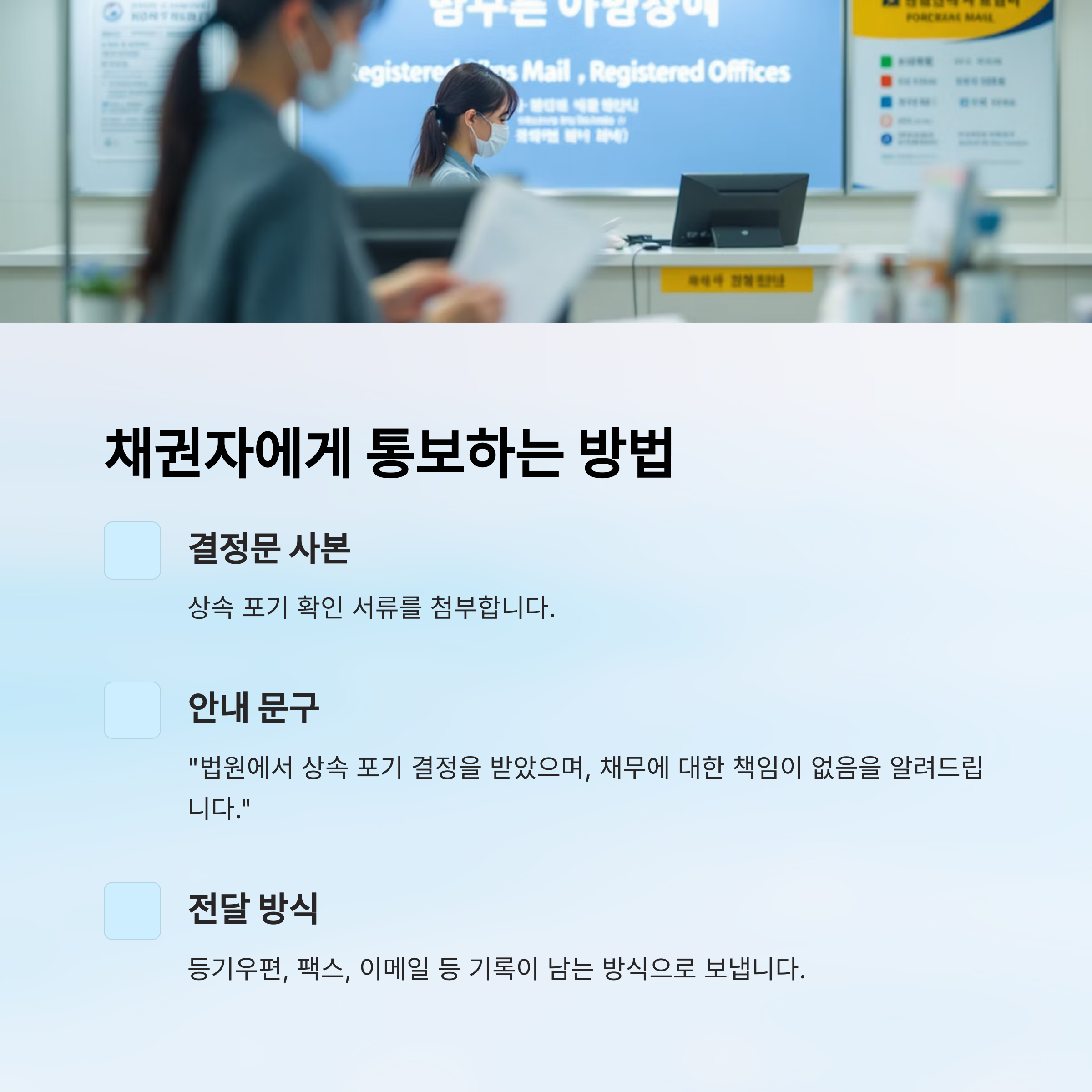 채권자에게는 ‘상속 포기 결정문 사본’과 간단한 안내 문구를 첨부해서 발송하면 돼요. 이메일, 등기우편, 팩스 등 다양한 방식이 있지만, ‘기록이 남는 방식’이 가장 좋아요. 우편이나 내용증명으로 보내면 추후 분쟁 방지에 효과적이에요.