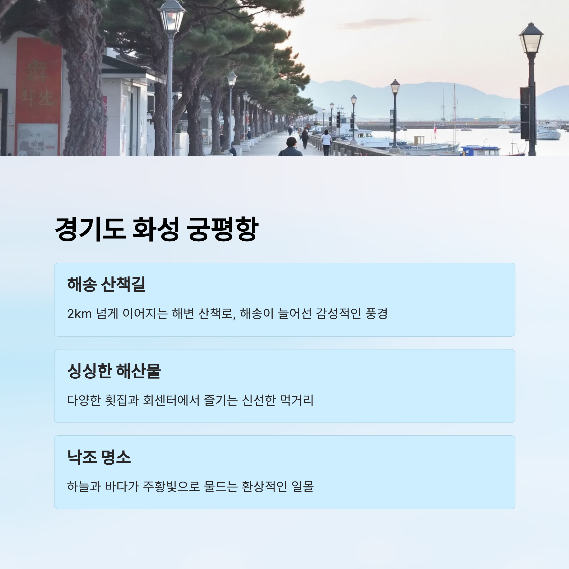 경기도 화성에 위치한 궁평항은 낙조 명소로 유명한 감성적인 항구예요. 해송이 늘어선 해변 산책로와 고즈넉한 포구 풍경이 어우러져 여유로운 기분을 느낄 수 있는 곳이에요. 수도권 남부 지역에서는 접근이 쉬워서 당일치기 여행으로 손색없어요.