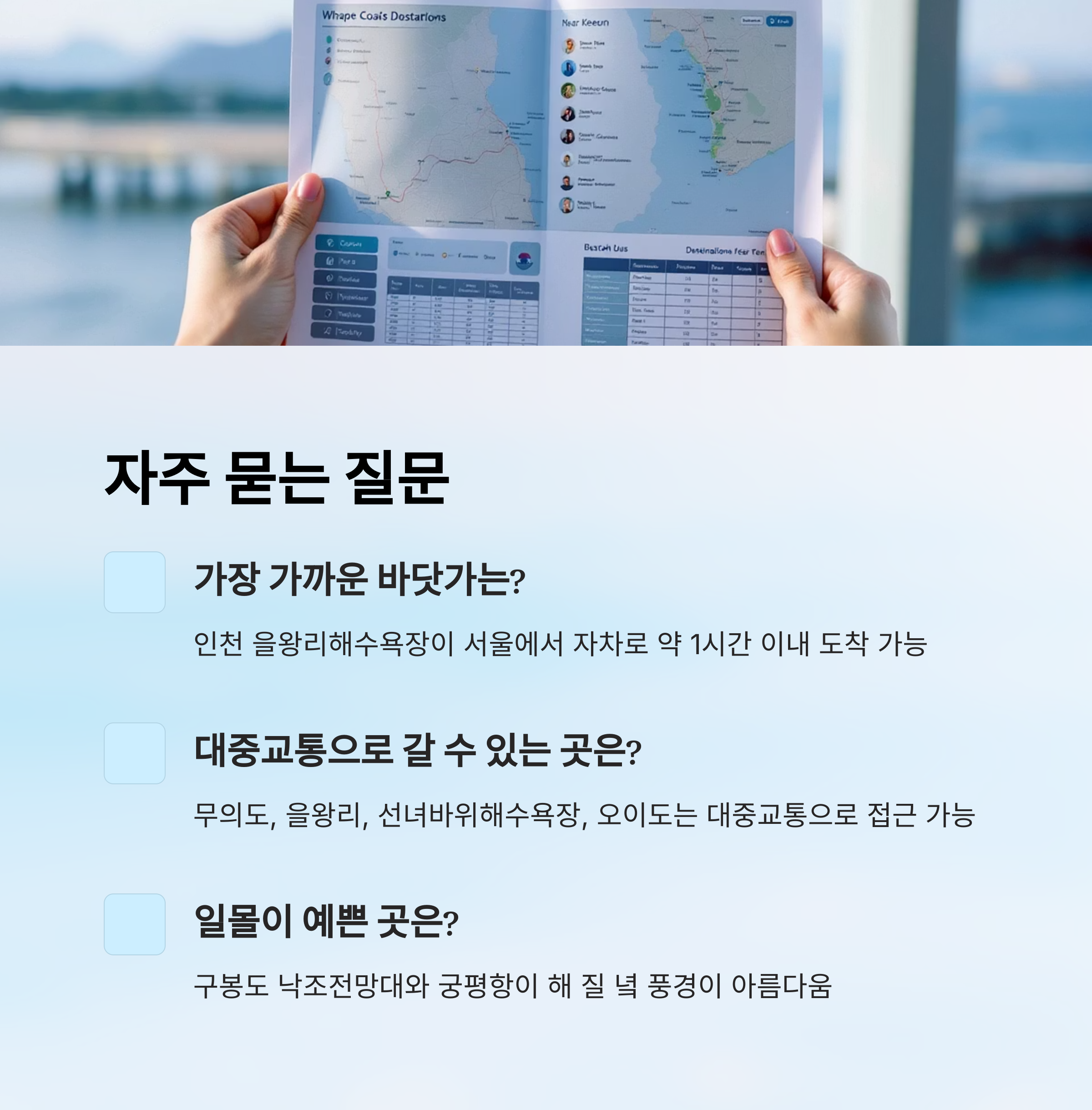 A1. 인천 을왕리해수욕장이 서울에서 자차로 약 1시간 이내로 도착할 수 있어 가장 가까운 바닷가 중 하나예요. 지하철+버스 조합으로도 갈 수 있어 접근성이 뛰어나요.