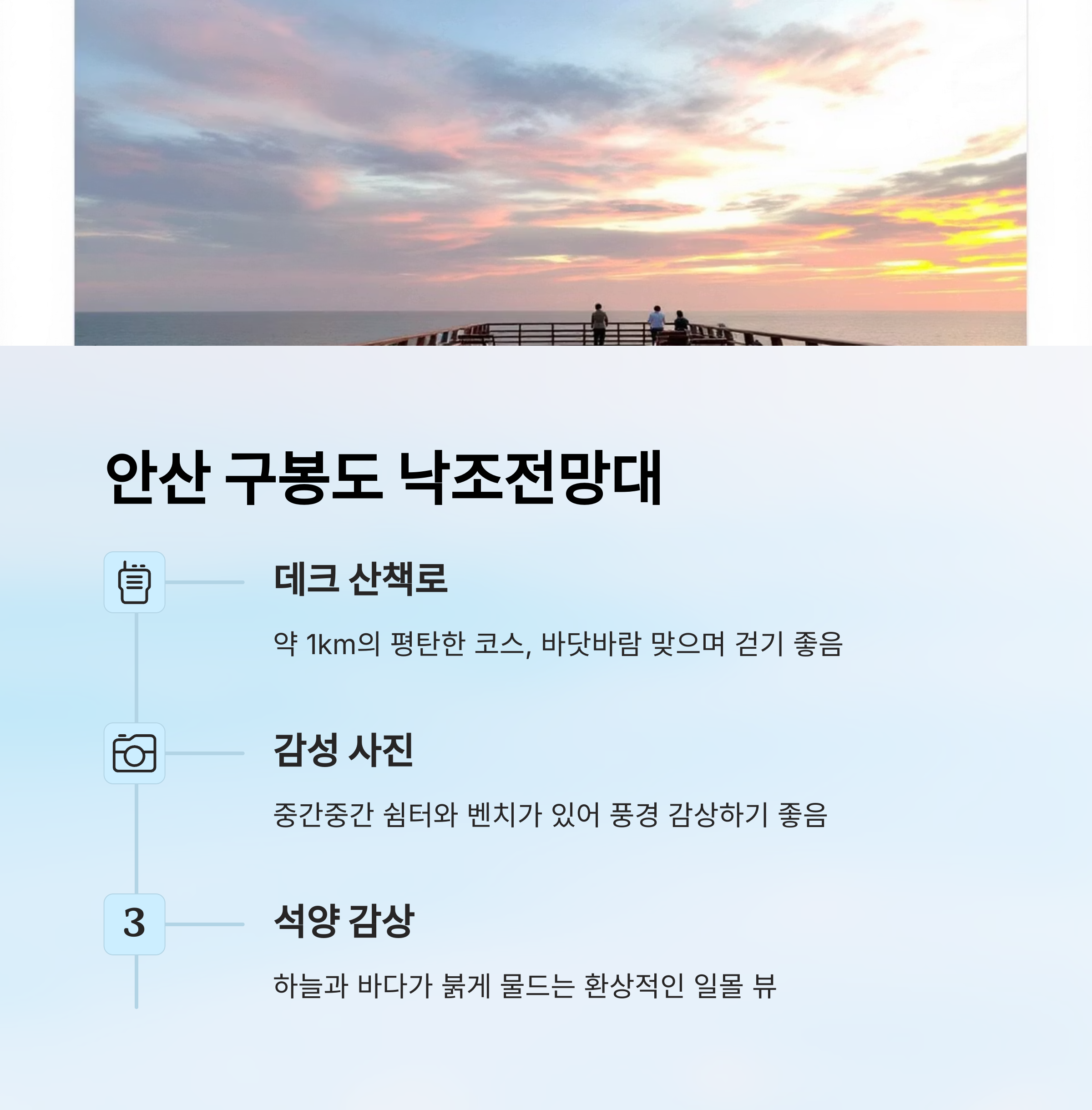 안산 대부도에 위치한 구봉도 낙조전망대는 낭만적인 일몰을 감상할 수 있는 서해의 대표 명소예요. 바다를 따라 놓여진 약 1km의 데크 산책로는 바닷바람을 맞으며 걷기에 너무 좋은 코스예요. 특히 봄에는 살랑이는 바람과 따뜻한 햇살이 더해져 걷기 정말 좋아요.