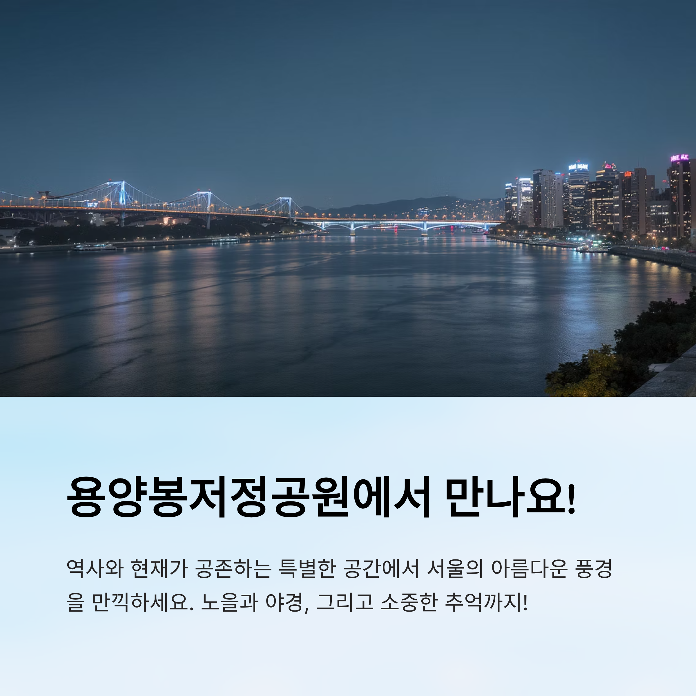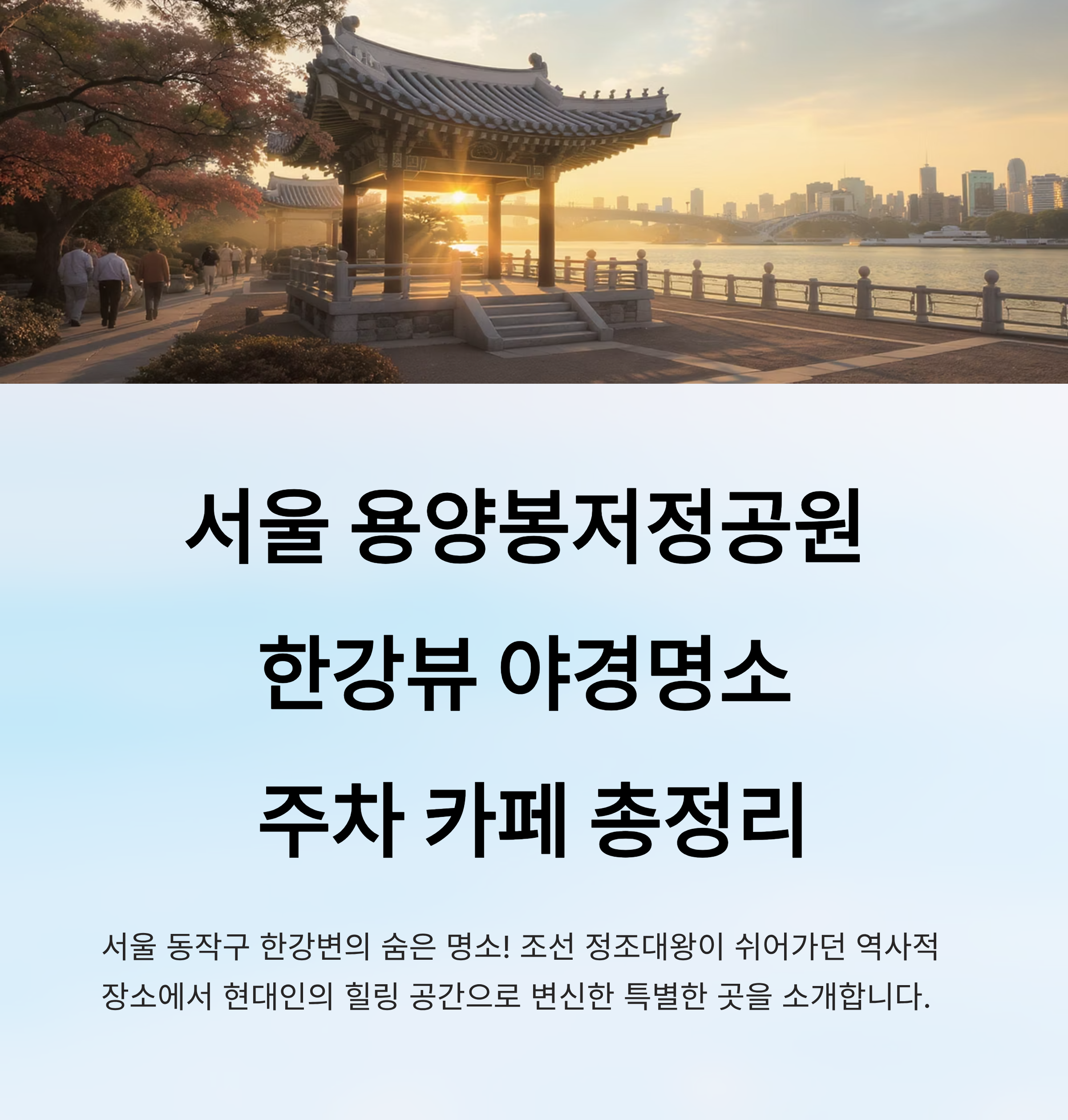 탁 트인 한강뷰, 전망대에서 바라보는 서울의 전경, 야경 명소로도 손꼽히는 이곳은 낮과 밤 모두 매력이 넘쳐요. 역사 속 휴식처에서 현대인의 힐링 명소로 변신한 용양봉저정공원, 오늘 함께 천천히 둘러봐요! 🏞️