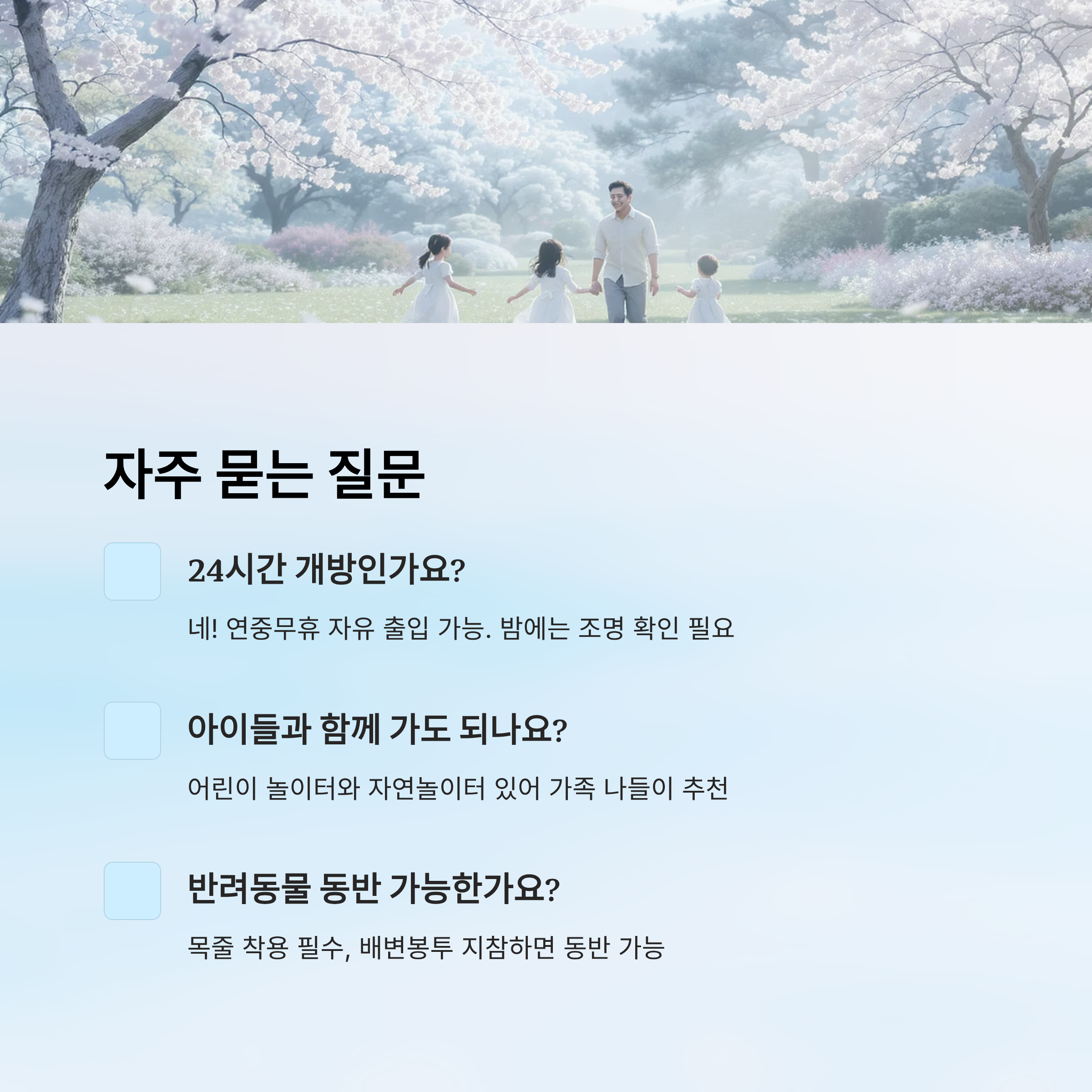 A1. 네! 공원은 연중무휴, 24시간 자유롭게 방문할 수 있어요. 다만 밤에는 조명이 어두운 구간이 있을 수 있으니 주의하세요.