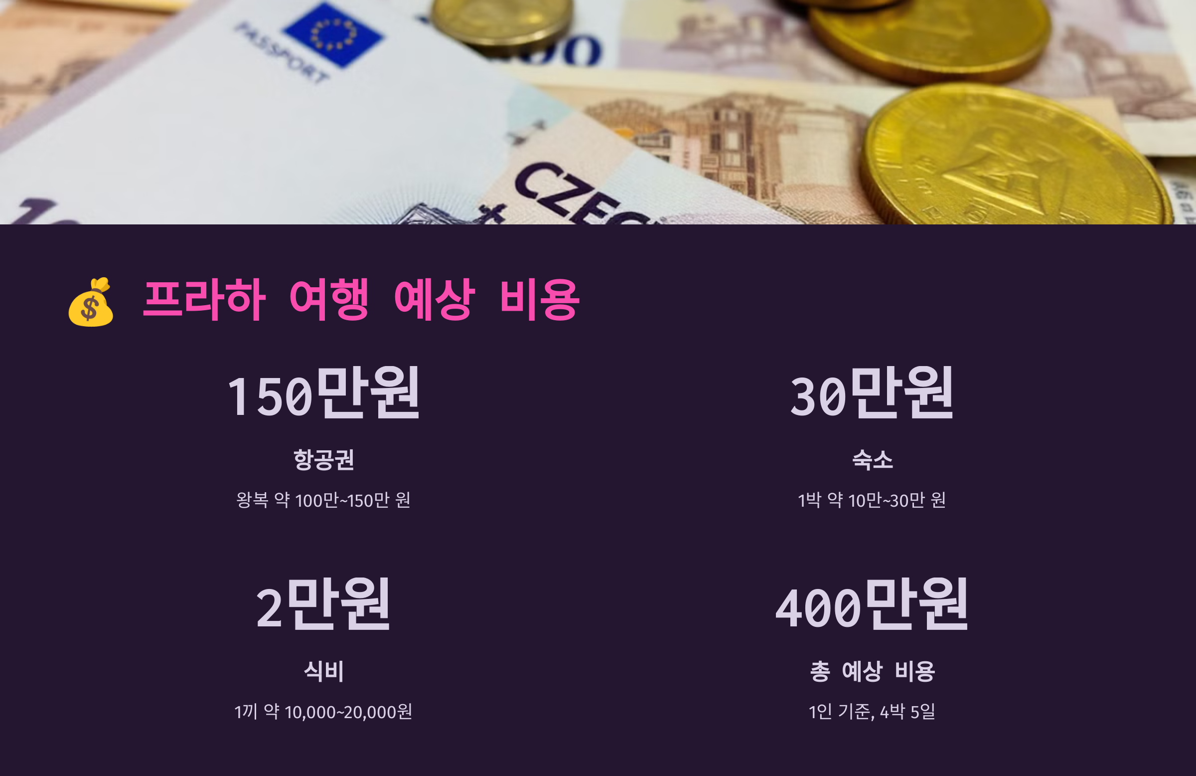 - 현지 화폐는 체코 코루나(CZK)이며, 유로도 일부 사용 가능합니다.