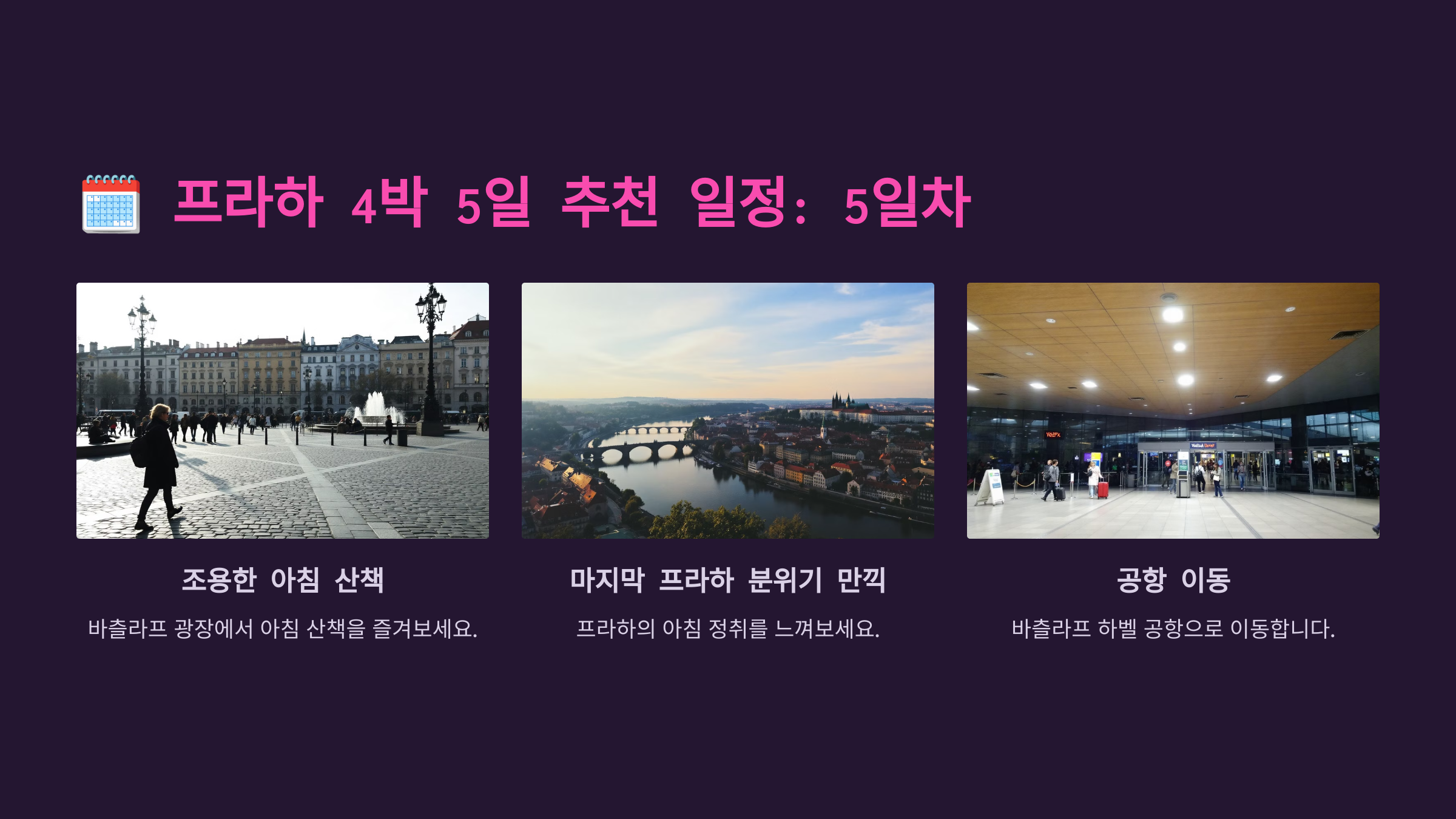 프라하의 중심지로, 중세 유럽의 정취를 느낄 수 있는 장소입니다.- 추천 활동: 천문 시계(Orloj) 감상, 거리 공연 구경