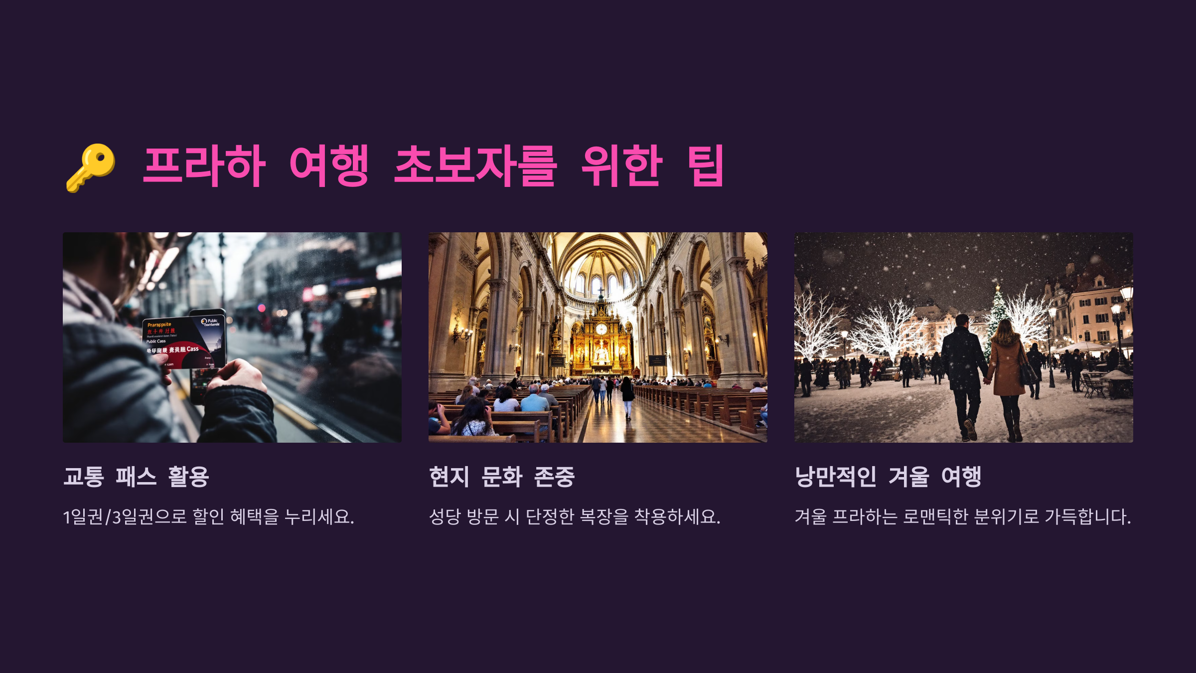 - 프라하의 대중교통은 효율적이고 저렴하며, 1일권/3일권으로 할인받을 수 있습니다.
