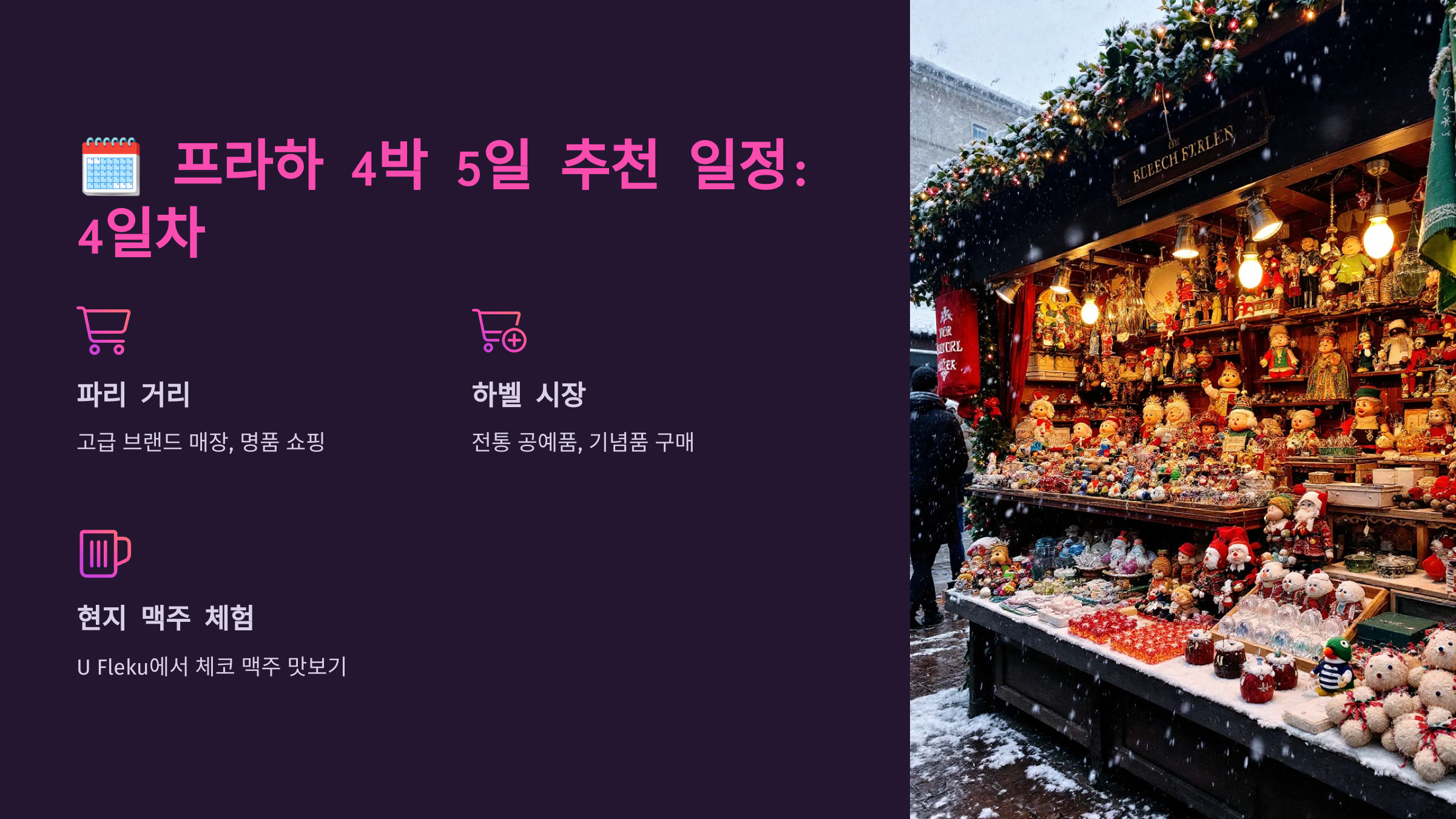 - 예산: 쇼핑 약 1,000~2,000 CZK(약 50,000~100,000원)