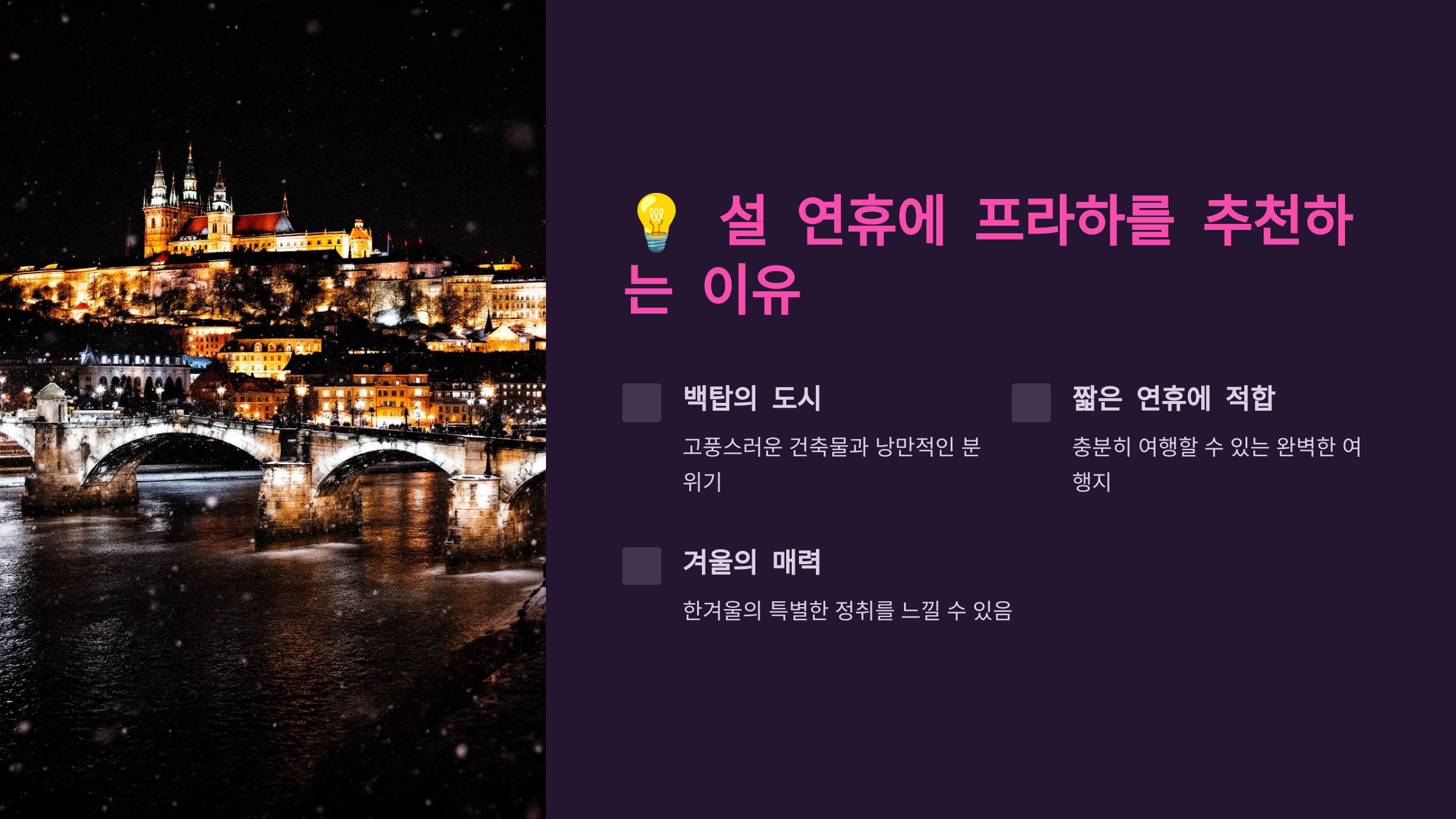 프라하는 체코의 수도로, '백탑의 도시'라는 별명을 가지고 있습니다. 고풍스러운 건축물과 낭만적인 분위기가 가득한 이곳은 짧은 연휴에도 충분히 여행할 수 있는 완벽한 여행지입니다. 특히 설 연휴 기간은 프라하가 한겨울의 매력을 뽐내는 시기로, 겨울 특유의 정취를 느낄 수 있어 더욱 특별합니다. ❄️✈️