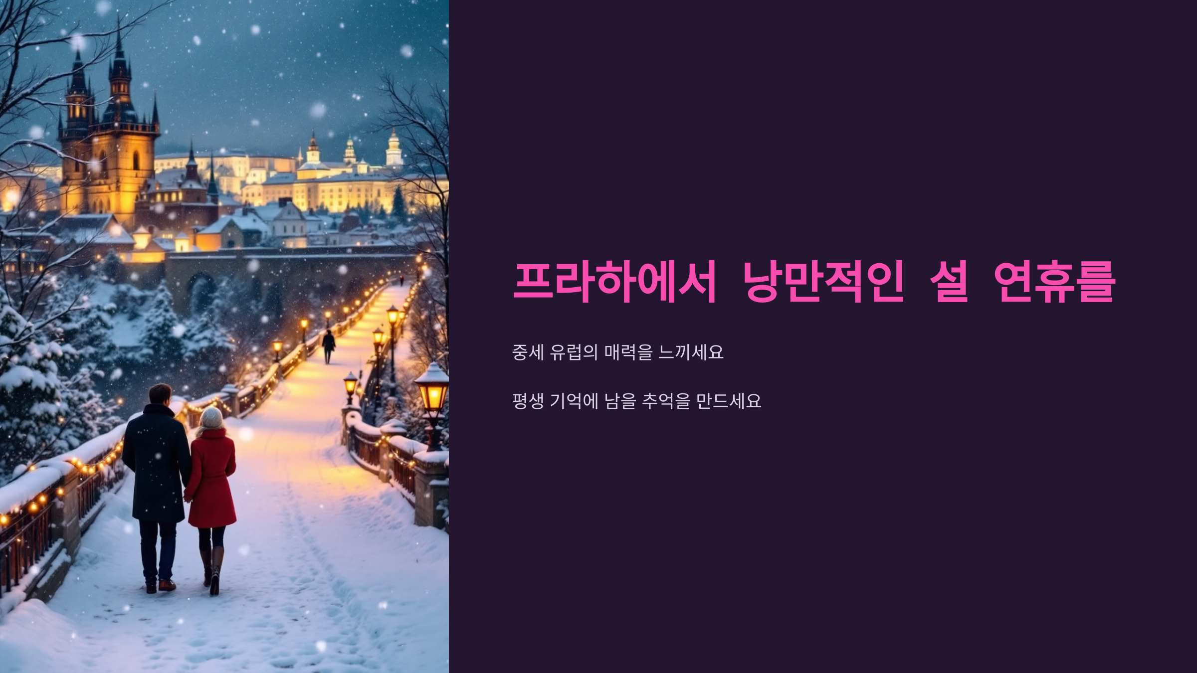 "이번 설 연휴, 체코 프라하에서 낭만적인 여행을 만들어 보세요. 중세 유럽의 매력을 느끼고 평생 기억에 남을 추억을 남겨보세요! 😊"