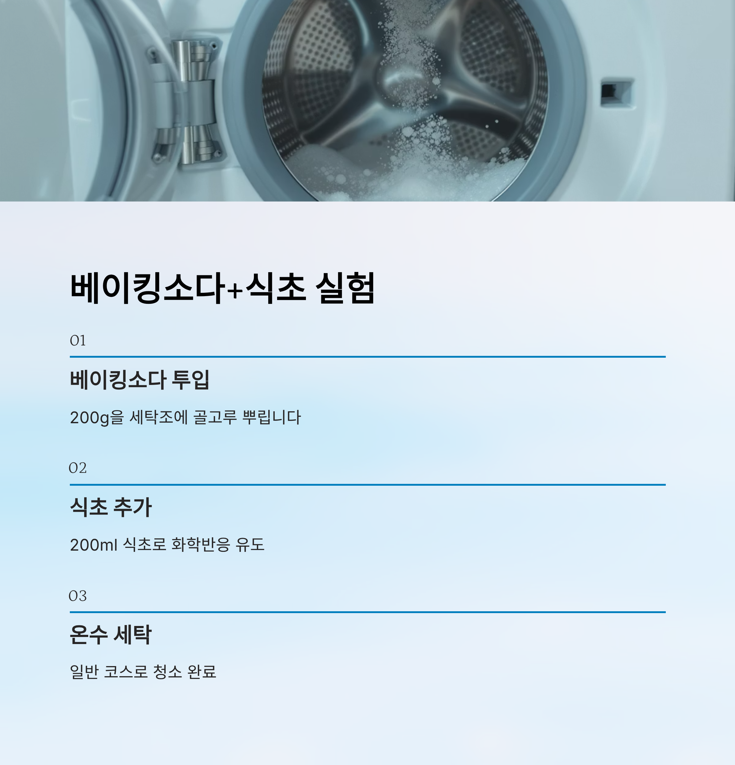 이번에는 천연 청소 조합으로 유명한 '베이킹소다+식초'를 이용한 실험이에요. 준비물은 베이킹소다 약 200g, 식초 200ml 정도로 간단하죠. 먼저 세탁조 안에 베이킹소다를 골고루 뿌린 다음, 식초를 부어 반응을 유도했어요.