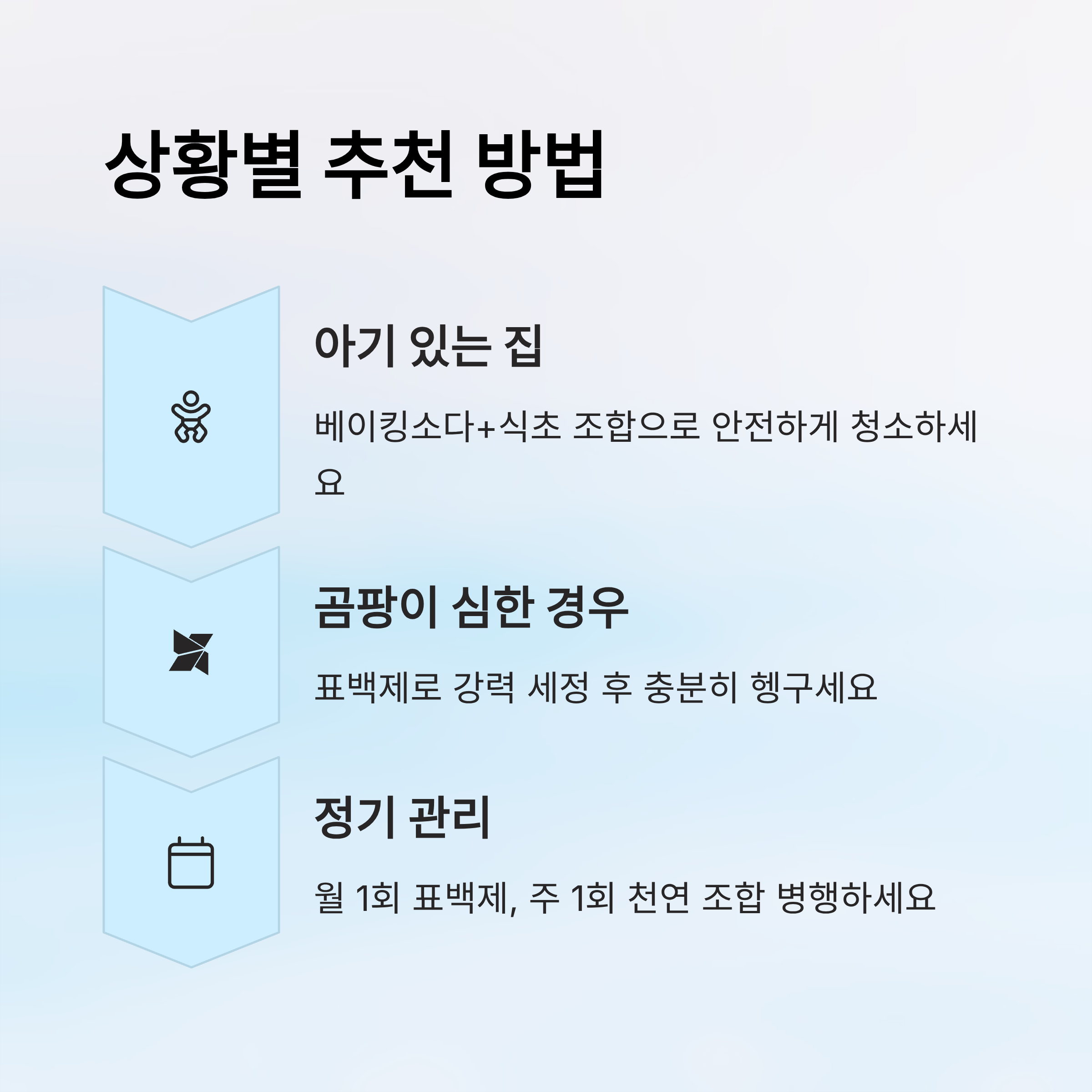 | 냄새 제거, 정기 관리 | 베이킹소다+식초 | 자주 해도 안전 |