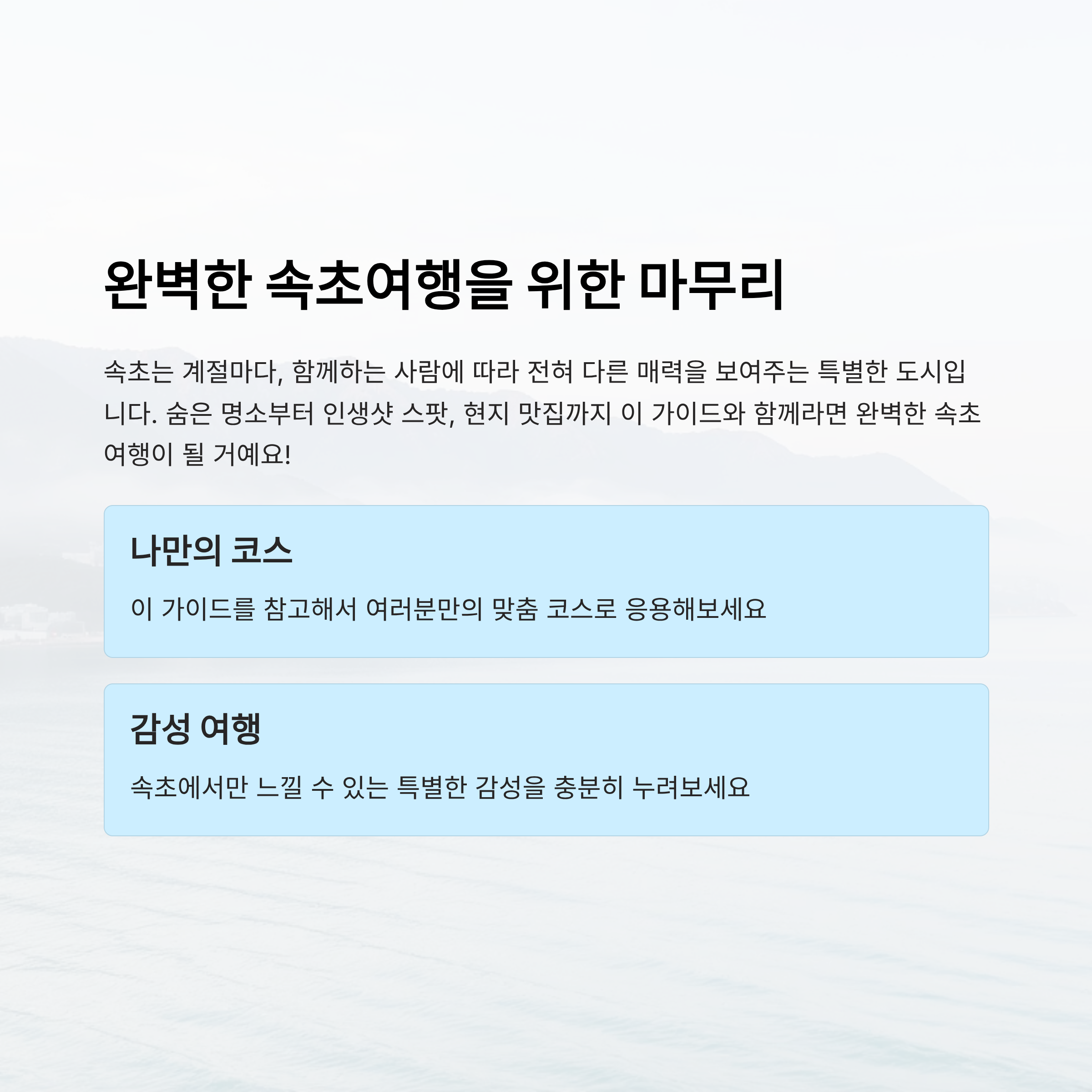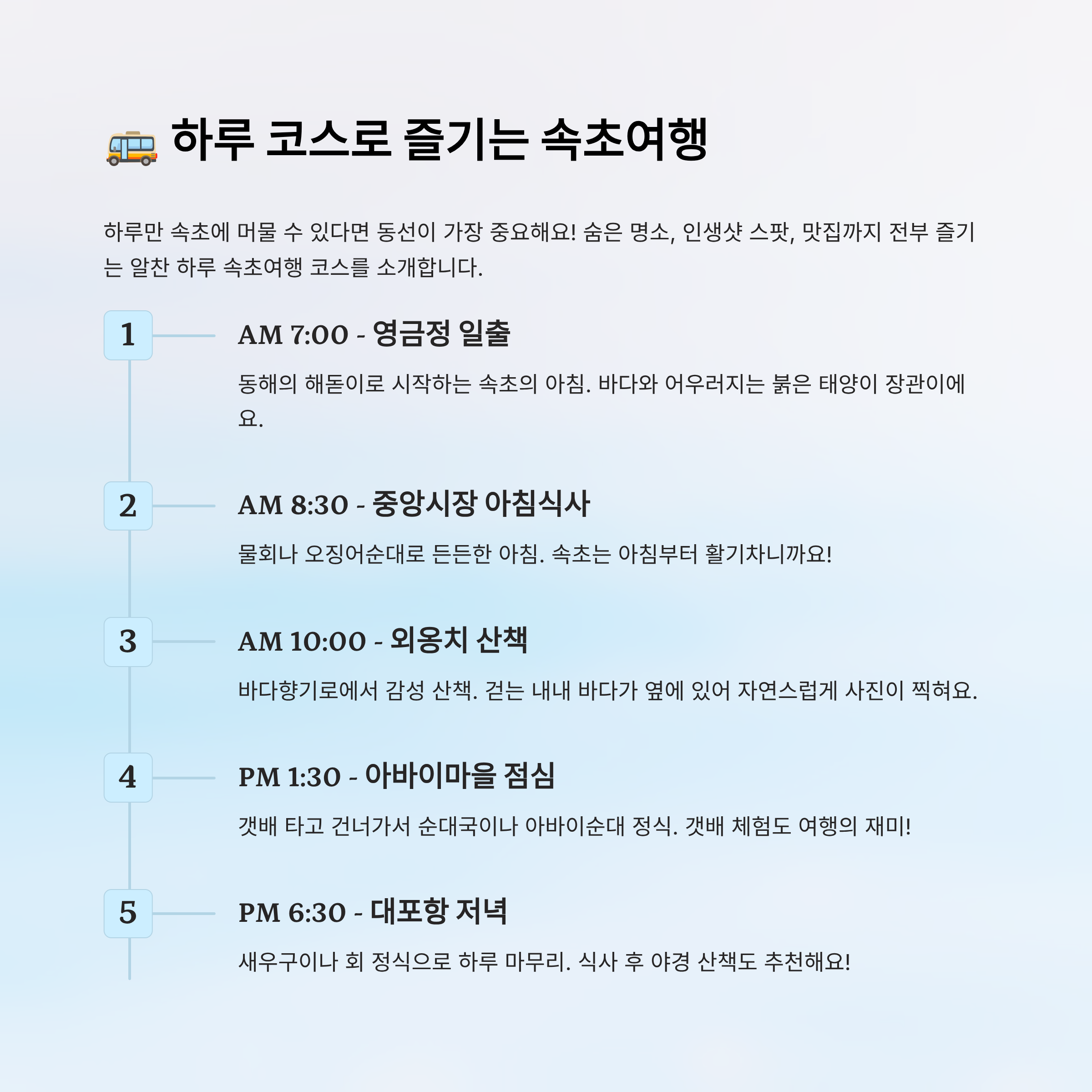속초는 작지만 콘텐츠가 꽉 찬 도시라 하루도 충분히 만족스러운 여행이 가능해요. 위 코스를 참고해서 여러분만의 ‘맞춤 코스’로 응용해보는 것도 좋겠죠?