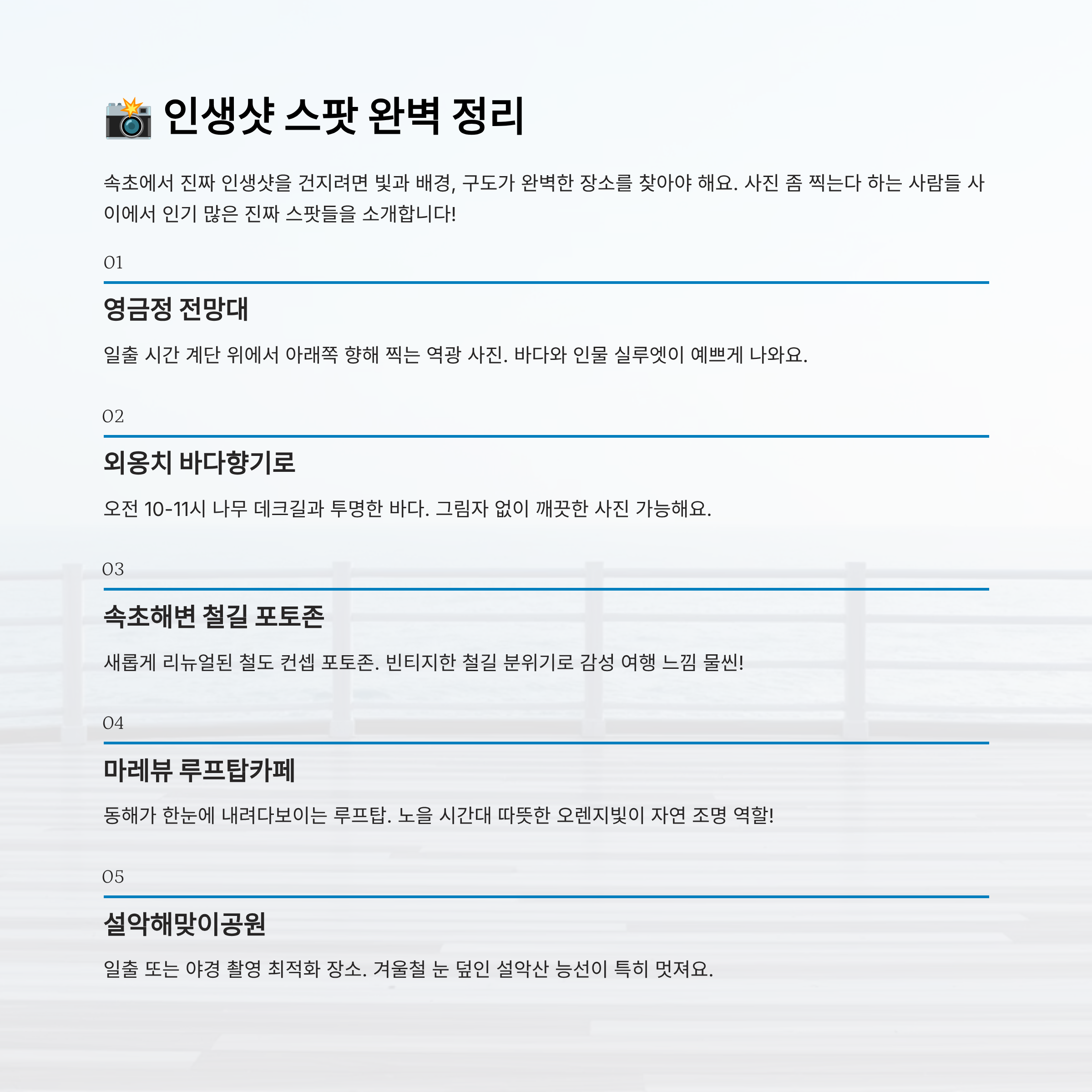 속초에서 인생샷 건지고 싶다면, 이제는 흔한 배경보다 ‘감성 포인트’를 찾아야 해요. 가장 핫한 인생샷 스팟은 단순히 예쁘기만 한 곳이 아니라, 빛과 배경, 구도가 완벽한 장소들이에요. 오늘은 사진 좀 찍는다 하는 사람들 사이에서 인기 많은 진짜 스팟들을 소개해볼게요!