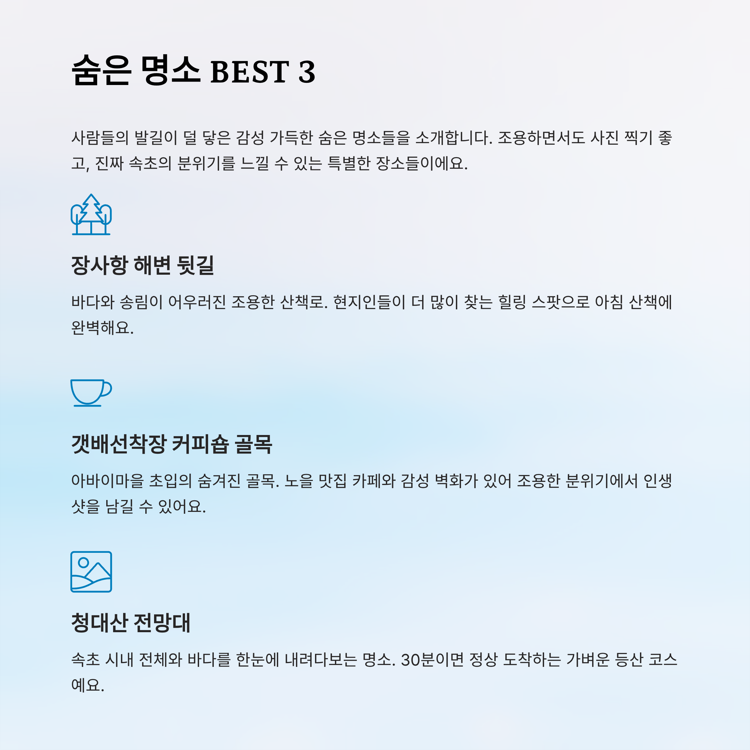 속초에는 유명한 관광지 외에도 사람들의 발길이 덜 닿은 감성 가득한 숨은 명소들이 있어요. 이런 곳은 조용하면서도 사진 찍기 좋고, 무엇보다 진짜 속초의 분위기를 느낄 수 있어서 여행자들 사이에서 입소문이 돌고 있어요.