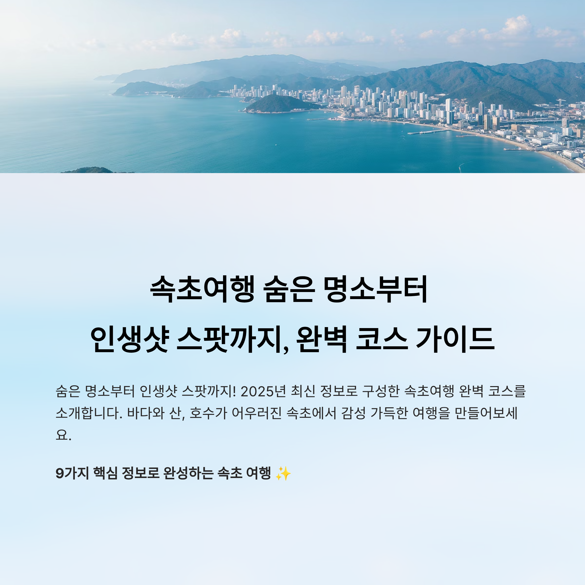 이번 글에서는 속초여행을 준비하는 모든 이들을 위해, 2025년 최신 정보를 기반으로 구성한 완벽한 여행 가이드를 소개할게요. 숨은 명소, 인생샷 스팟, 하루 코스, 계절별 추천 장소까지 전부 담았으니 놓치지 말고 확인해보세요! ✨