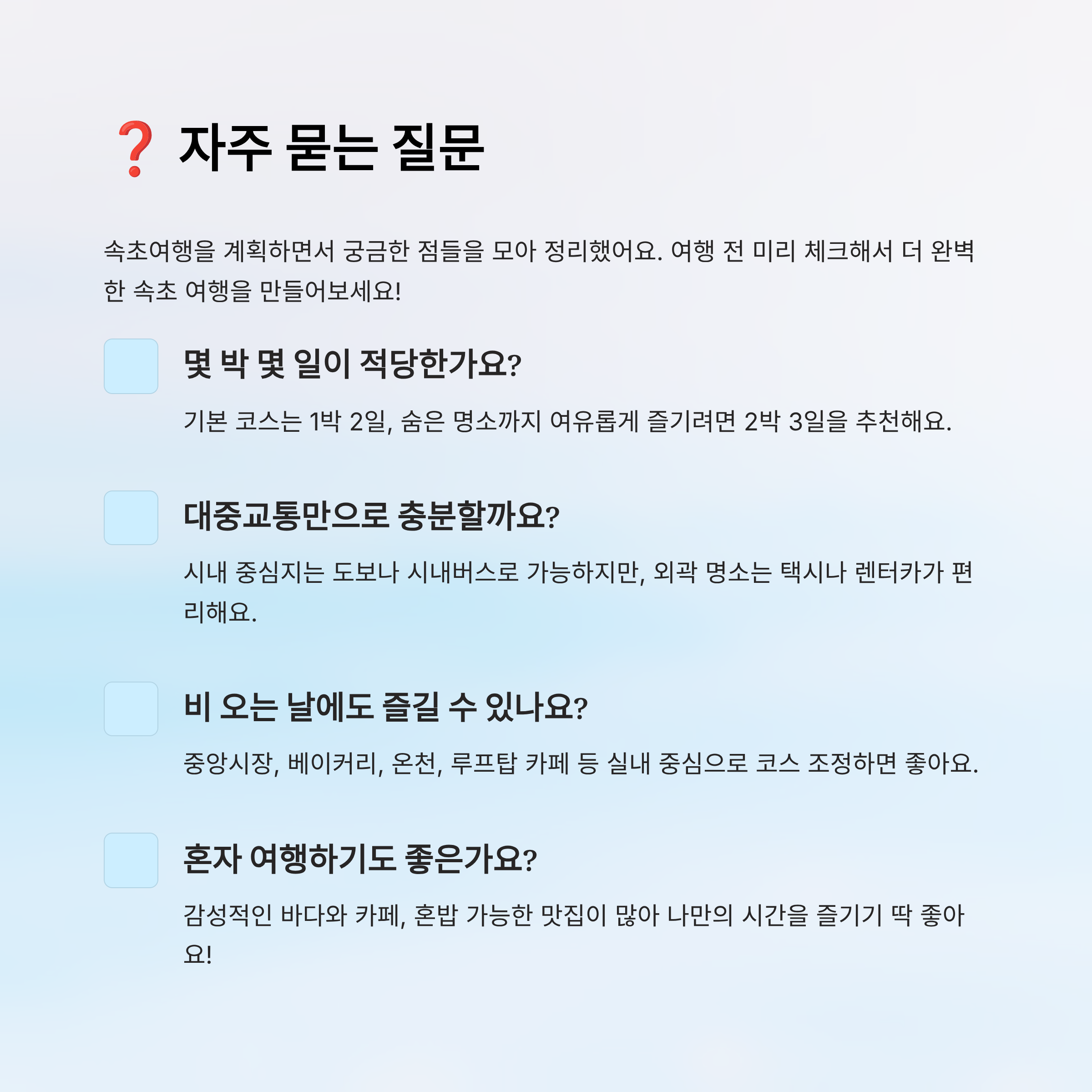 A8. 네! 속초는 혼자 여행하는 분들도 많아요. 감성적인 바다와 카페, 혼밥 가능한 맛집이 많아 오히려 나만의 시간을 즐기기에 좋은 도시예요. 걷기 좋은 코스도 많아 산책하기 딱 좋아요.