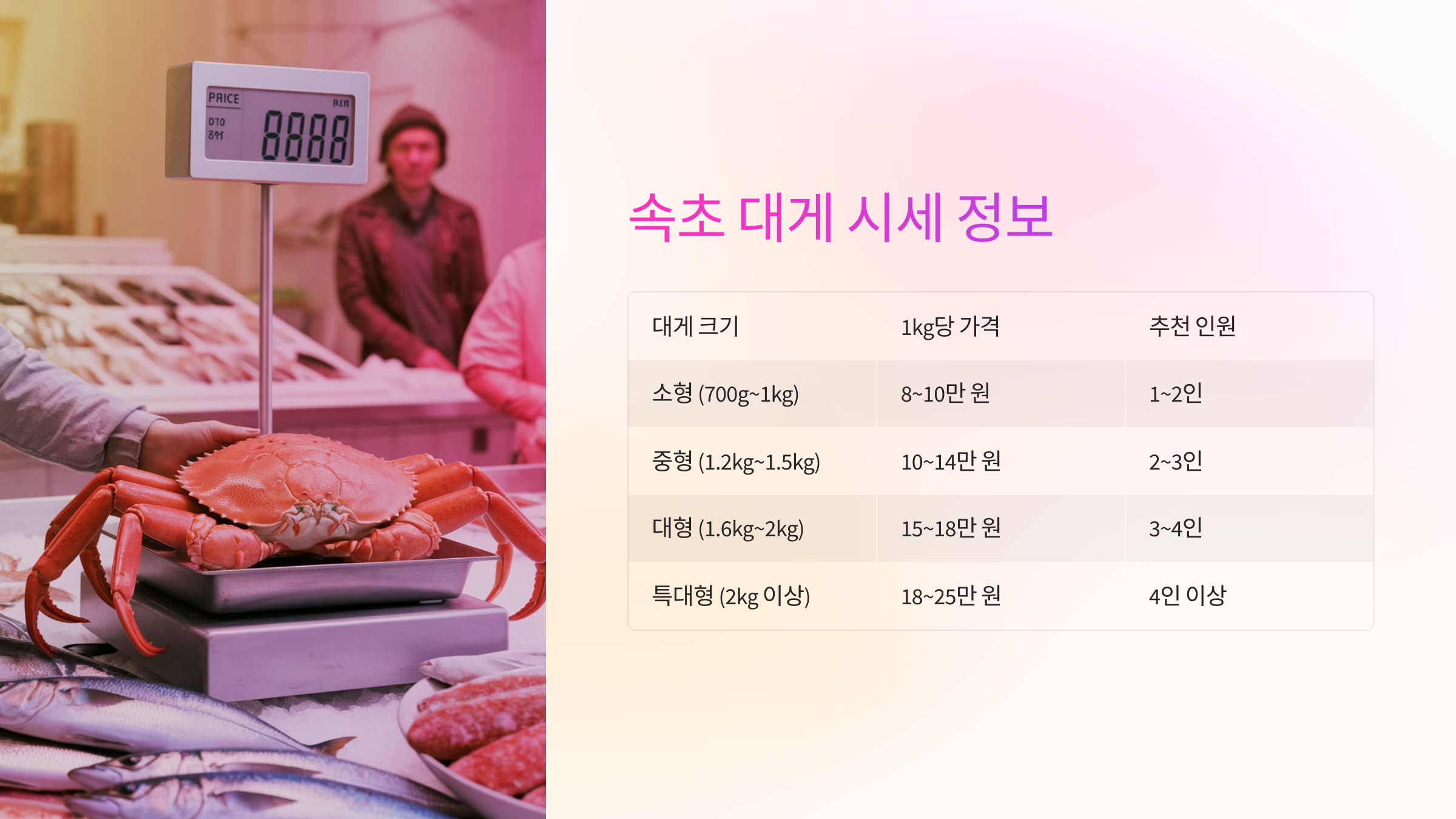 | 대게 크기 | 1kg당 가격 (평균) | 추천 인원 |