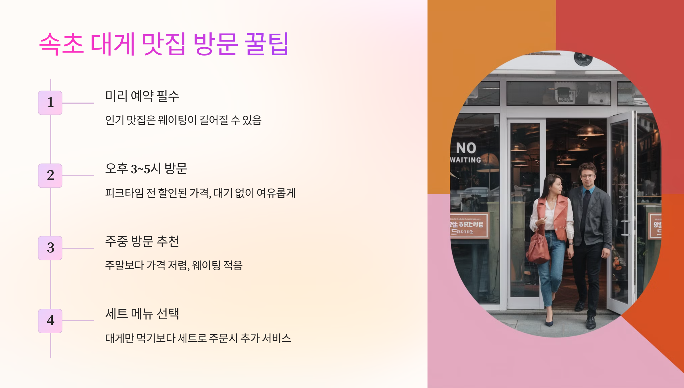 - 오후 3~5시 방문 - 저녁 피크타임 전에 가면 대기 없이 여유롭게 먹을 수 있어요.