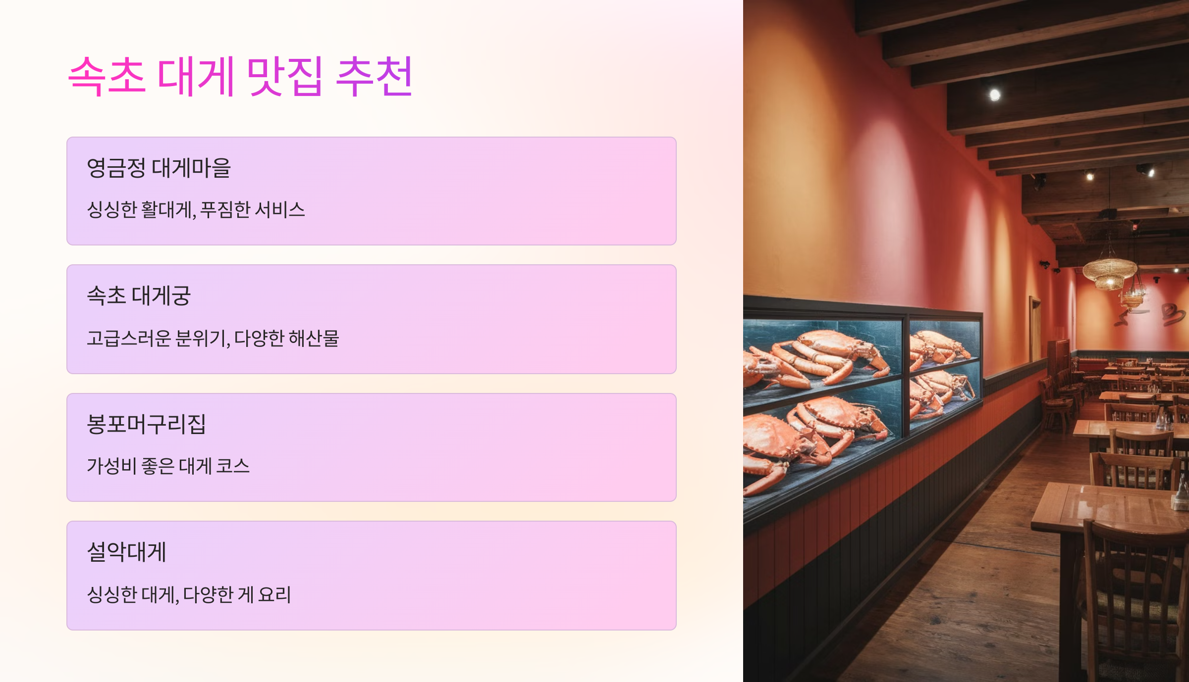 이 가이드를 참고하면 **속초에서 실패 없는 대게 맛집 선택이 가능할 거예요!** 😊