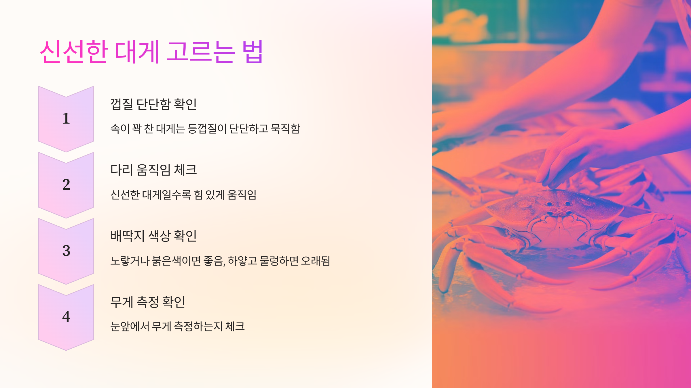 - 대게는 크기보다 살이 꽉 찬 게 중요! - 무게보다 살이 꽉 찬 대게를 선택하는 게 만족도가 높아요.