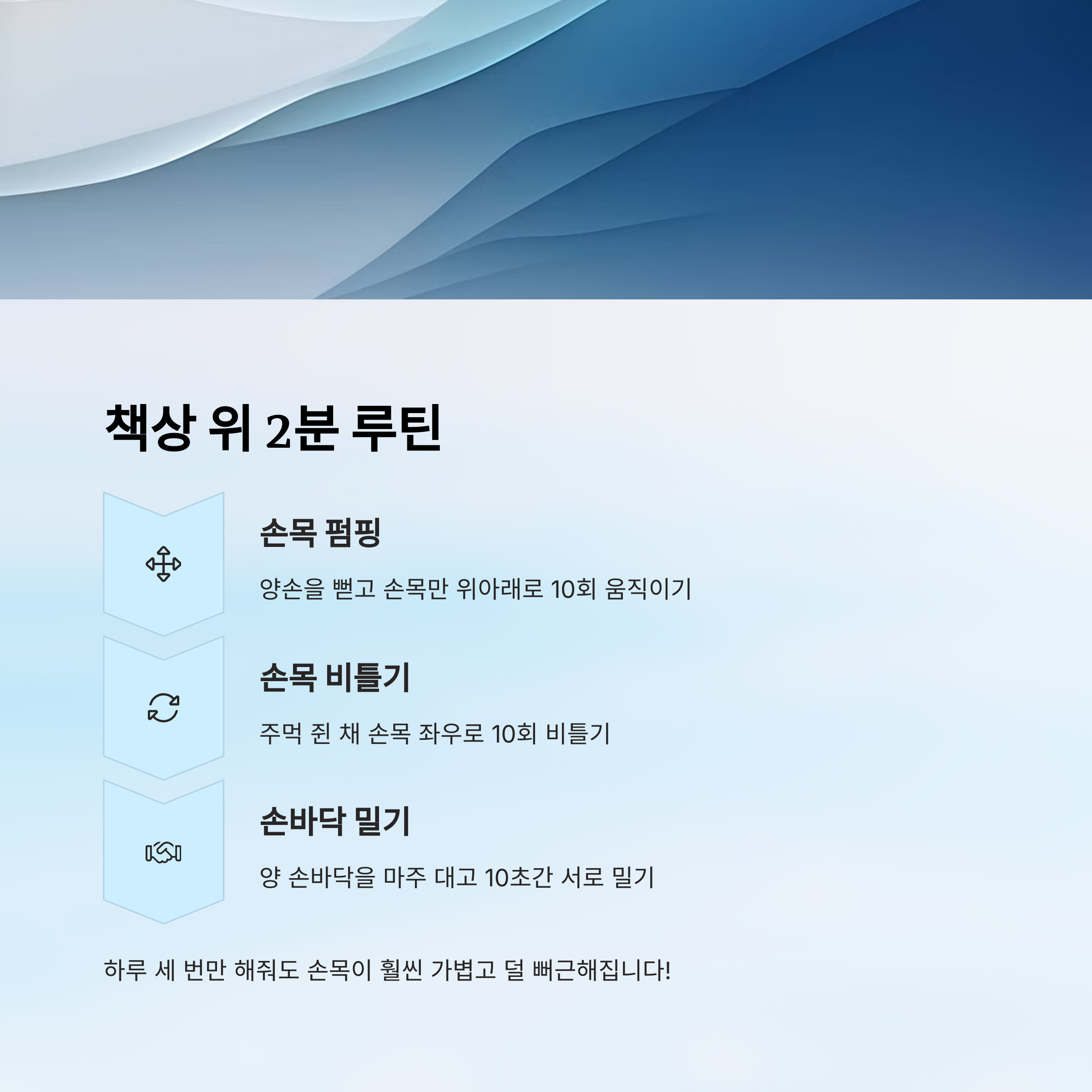 이 루틴은 피로를 풀고, 손목 관절 주변 근육을 자극해서 순환을 도와주는 데 아주 효과적이에요. 하루 세 번만 해줘도 손목이 훨씬 가볍고 덜 뻐근해진답니다!