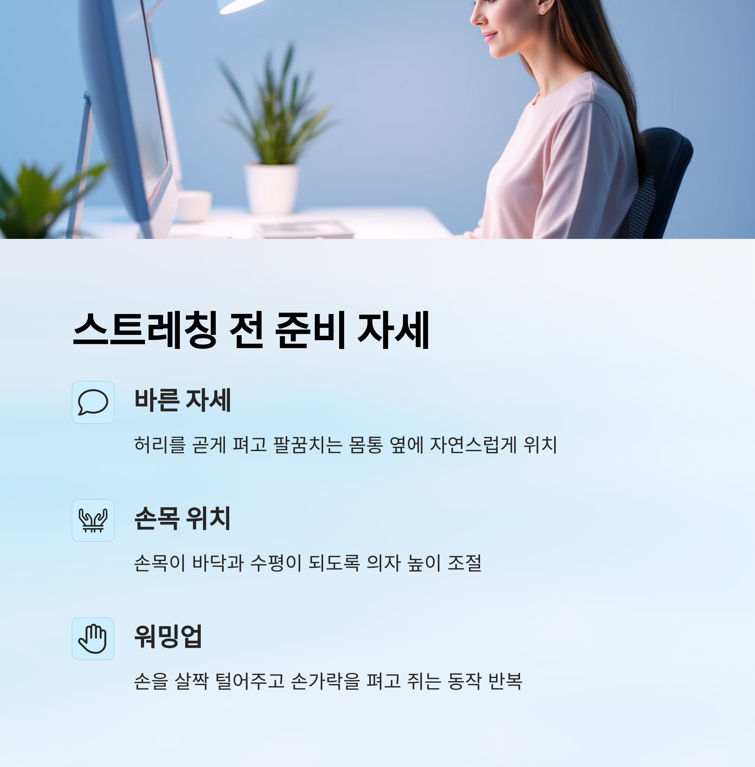 가장 기본은 ‘좋은 자세’예요. 의자에 허리를 곧게 펴고 바르게 앉은 상태에서 양팔을 몸통 옆으로 자연스럽게 내리는 게 좋아요. 어깨에 힘을 빼고, 팔꿈치를 굽힌 채 손목만 움직일 수 있도록 준비해요.