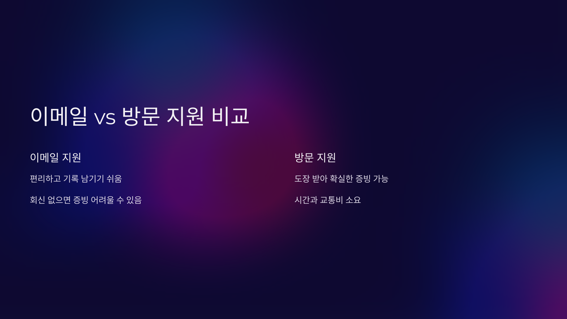 결론적으로, 이메일 지원은 편리하지만 회신을 받지 못하면 증빙이 어려울 수 있어요. 방문 지원은 확실한 증빙이 가능하지만 번거롭죠. 상황에 맞게 적절한 방법을 선택하는 것이 중요해요! 📩🚶