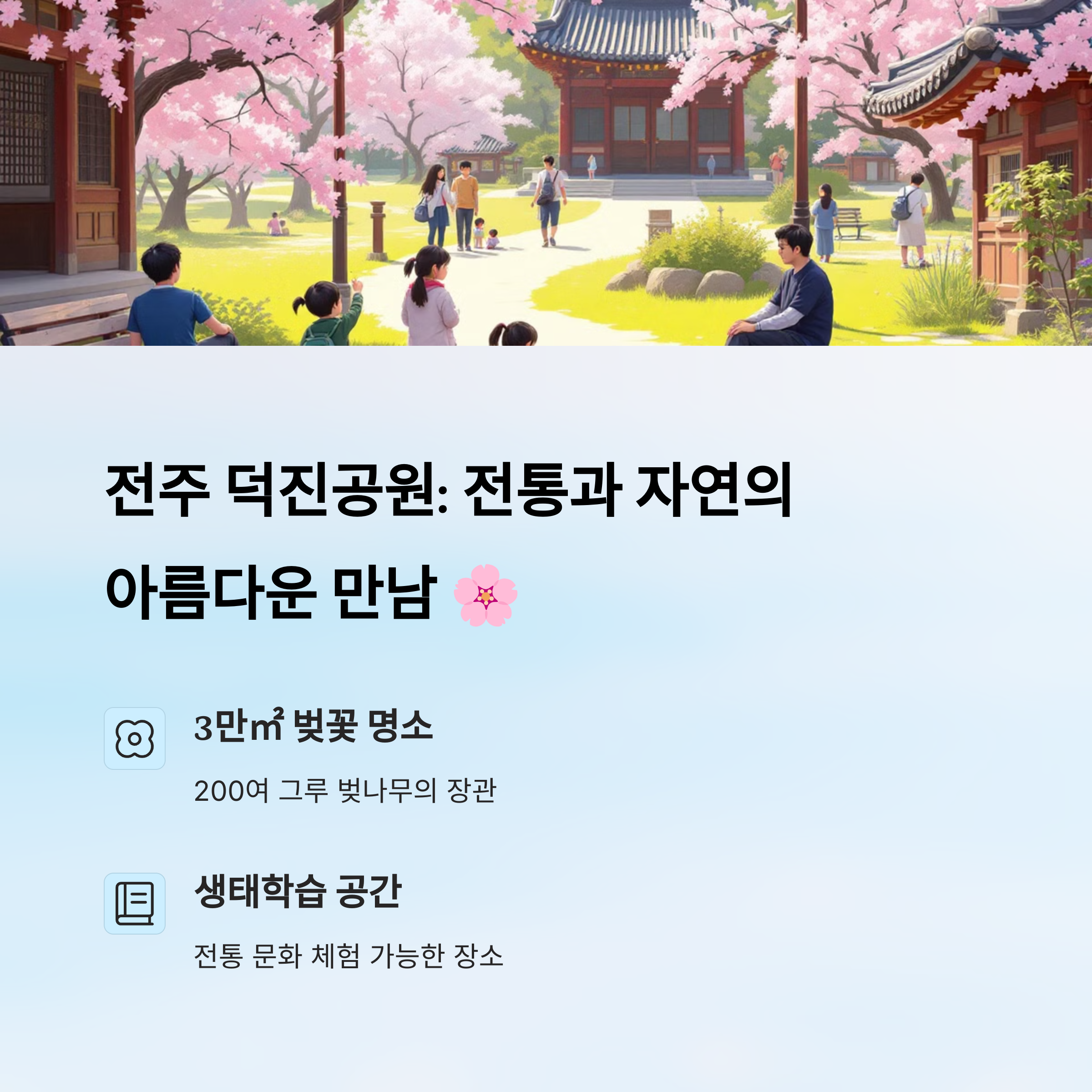 근처에 한옥마을도 있어 피크닉이나 간단한 한복 체험을 더해도 특별한 하루가 되죠. 전주에 간다면 덕진공원은 꼭 들러봐야 할 벚꽃 명소 중 하나예요!